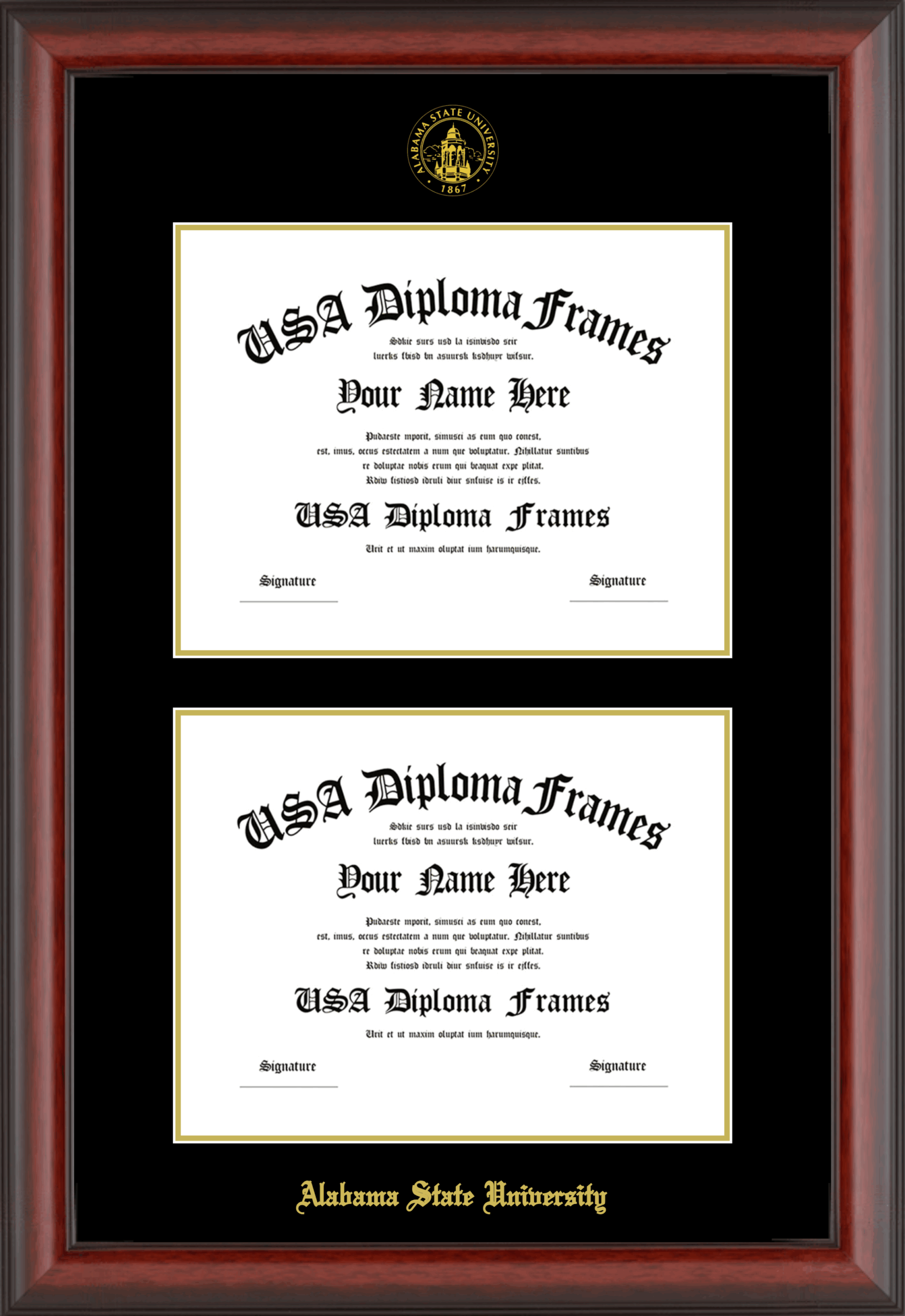 Alabama State University Double Diploma Frame – Double Document – Cherry Mahogany Matte – Black and Gold Mat