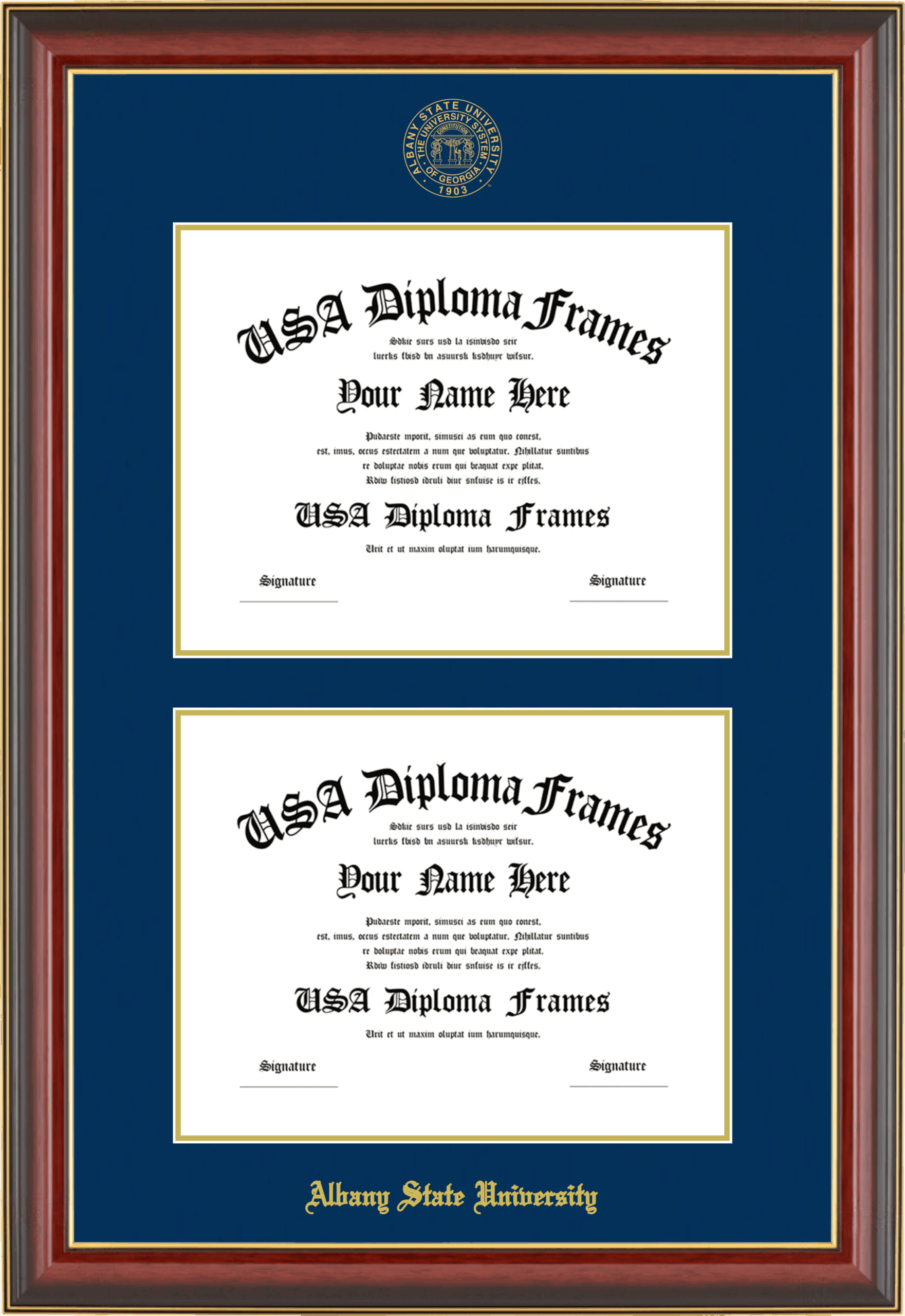 Albany State University Double Diploma Frame – Double Document – Cherry Mahogany Gold Trim Glossy – Navy and Gold Mat