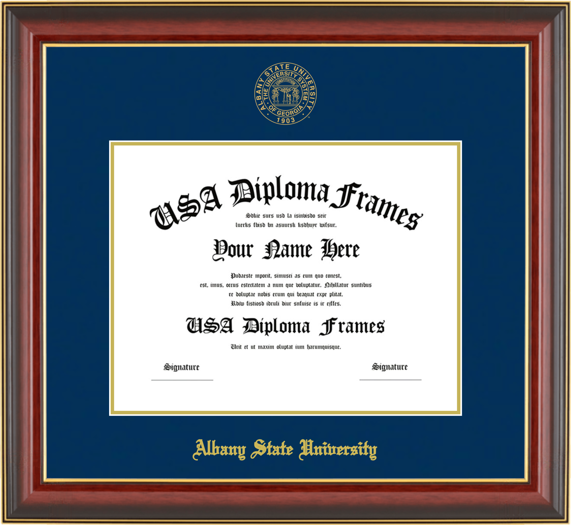Albany State University Diploma Frame – Cherry Mahogany Gold Trim Glossy – Navy and Gold Mat