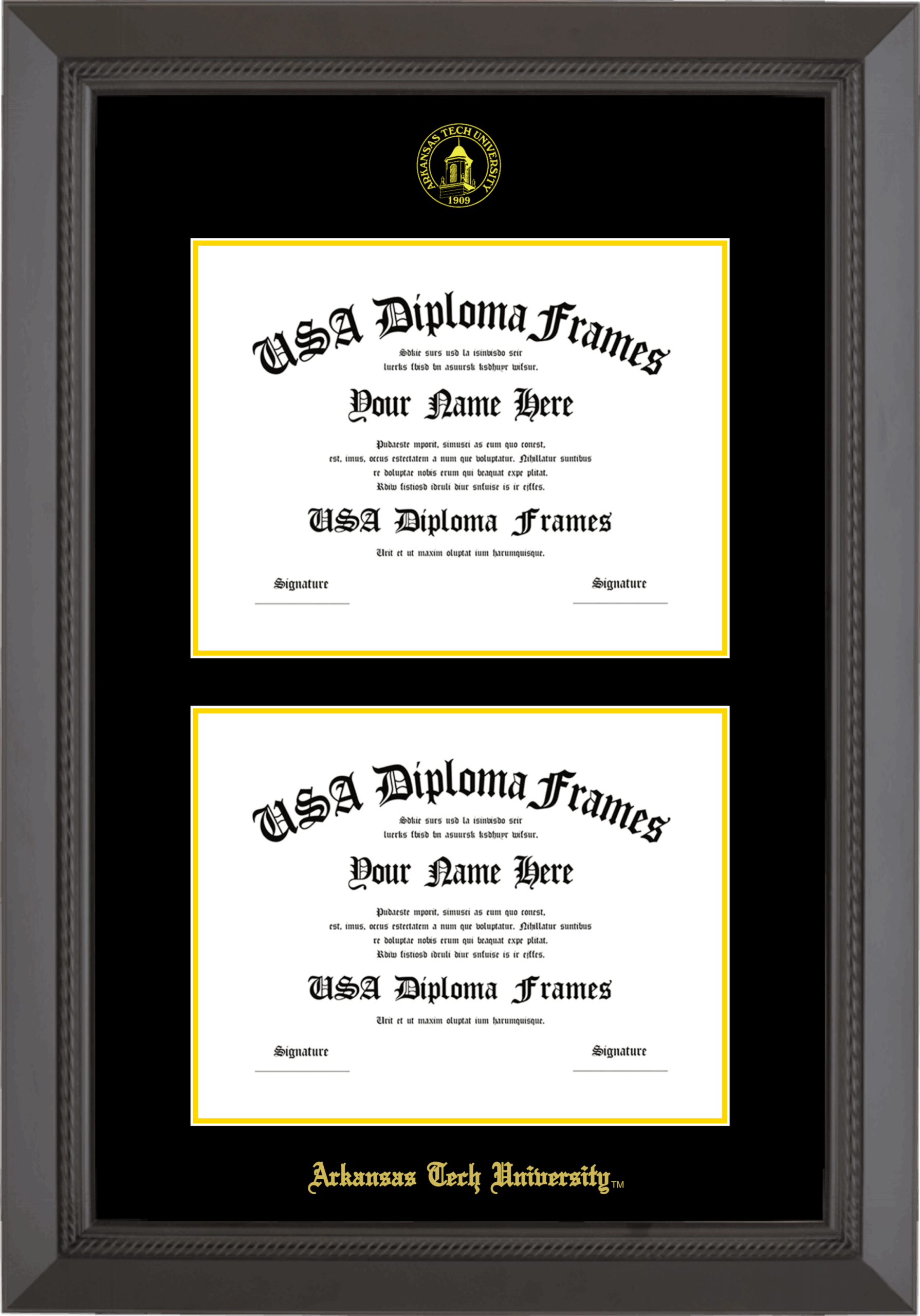 Arkansas Tech University Double Diploma Frame – Double Document – Black Rope – Black and Yellow Gold Mat
