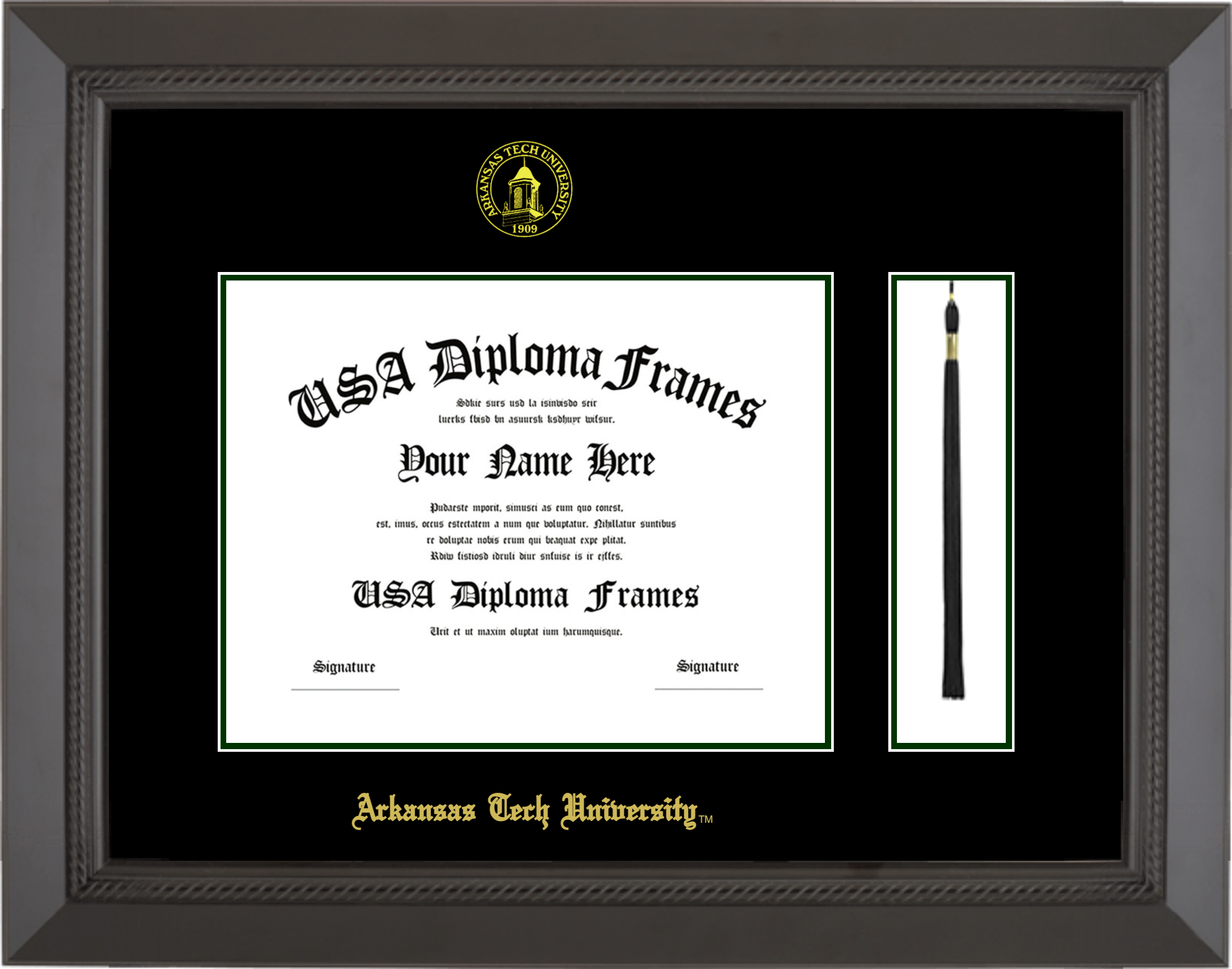 Arkansas Tech University Diploma Frame with Tassel – Black Rope – Black and Winter Green Mat