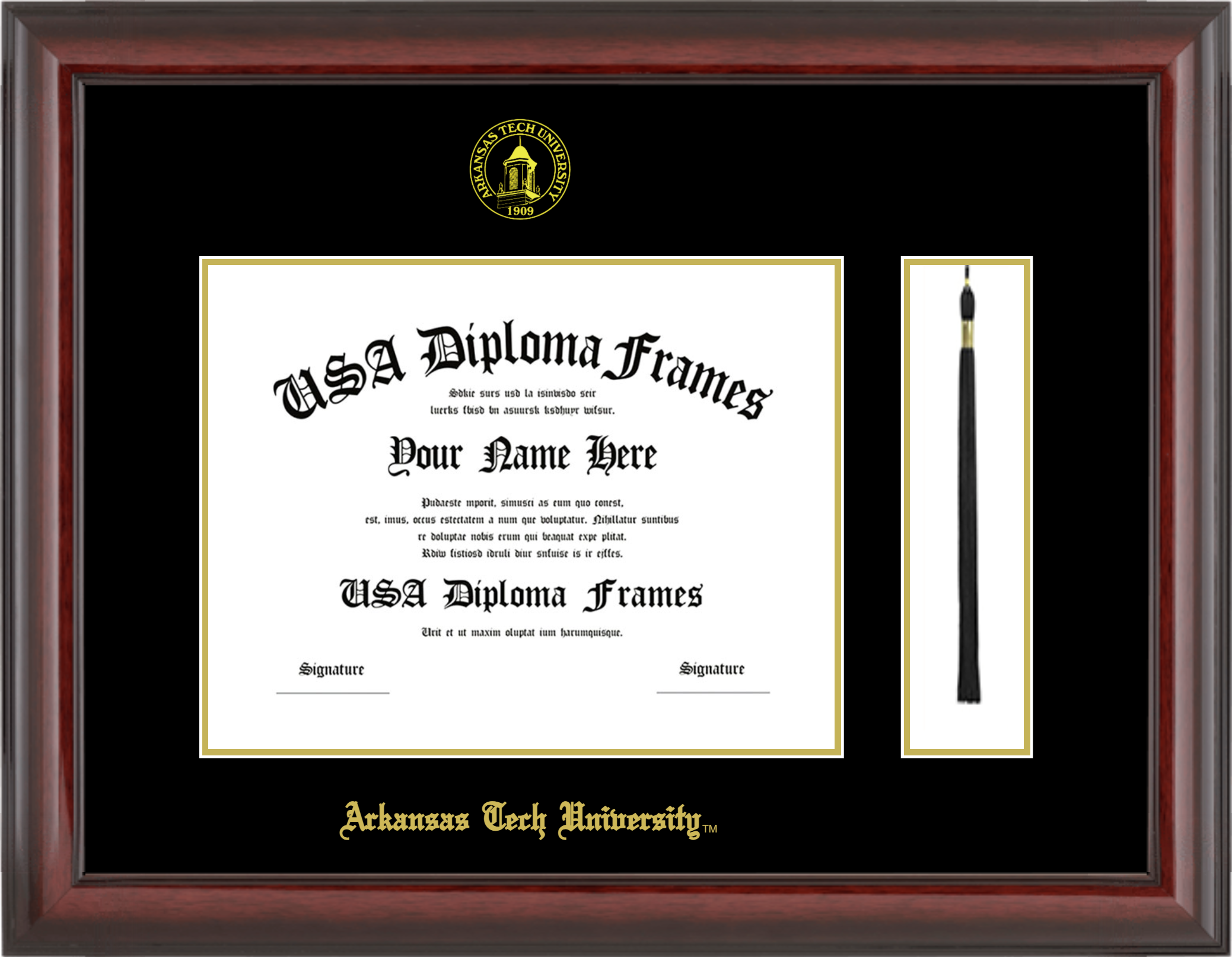 Arkansas Tech University Diploma Frame with Tassel – Cherry Mahogany Glossy – Black and Gold Mat