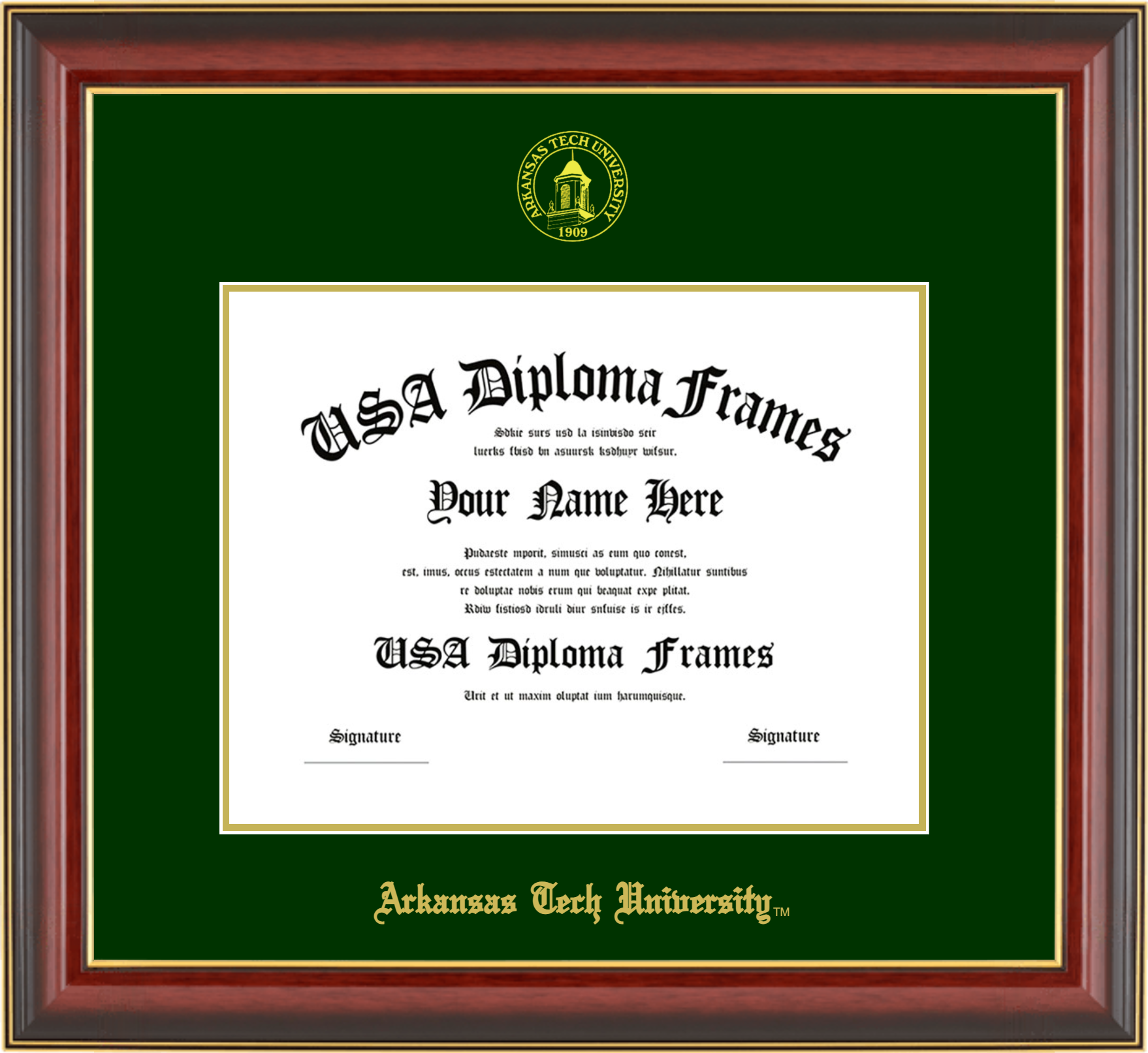 Arkansas Tech University – Single Horizontal Document ( Diploma ) – Cherry Mahogany Gold Trim Glossy – Winter Green Mat – Gold Accent Mat – With Seal(University Seal Gold) – With Gold Embossing (Arkansas Tech University)