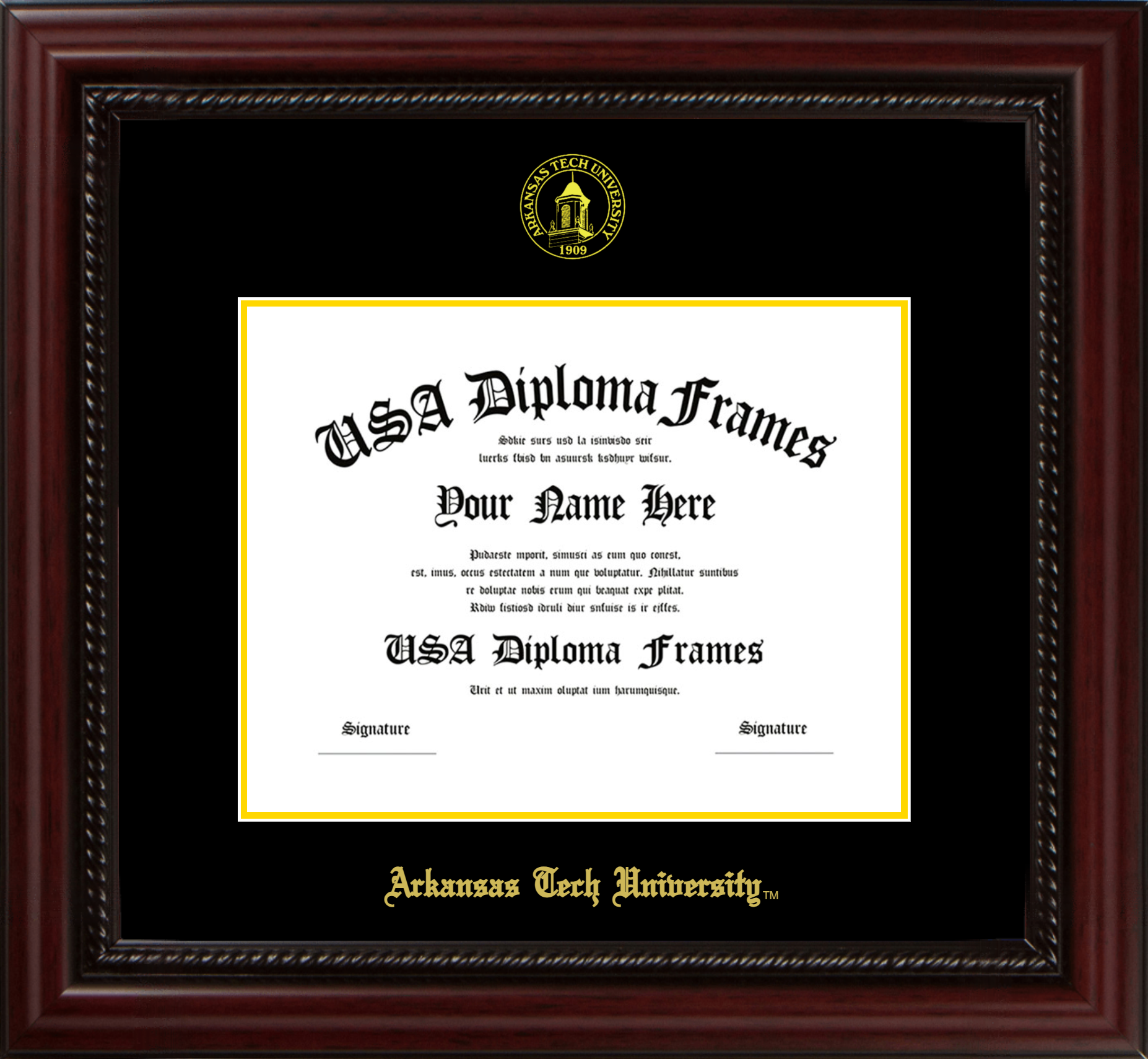 Arkansas Tech University Diploma Frame – Executive Cherry Rope – Black and Yellow Gold Mat