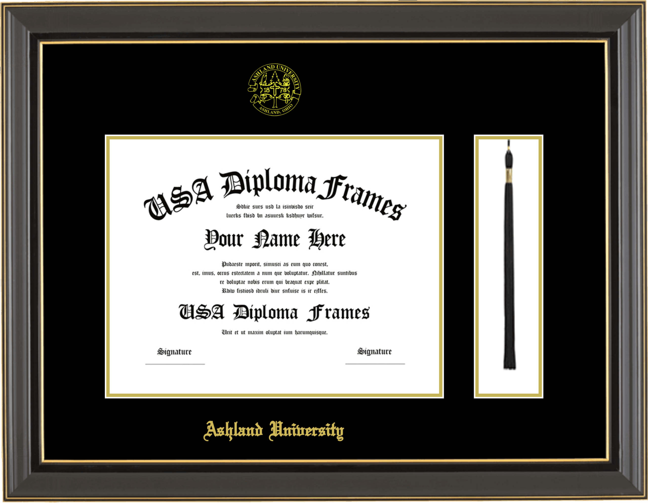 Ashland University Diploma Frame with Tassel – Black Gold Trim Glossy – Black and Gold Mat