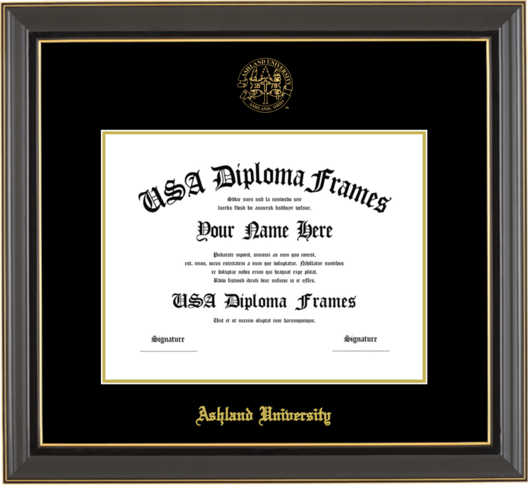 Ashland University Diploma Frame – Black Gold Trim Glossy – Black and Gold Mat