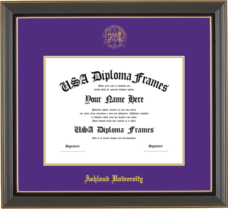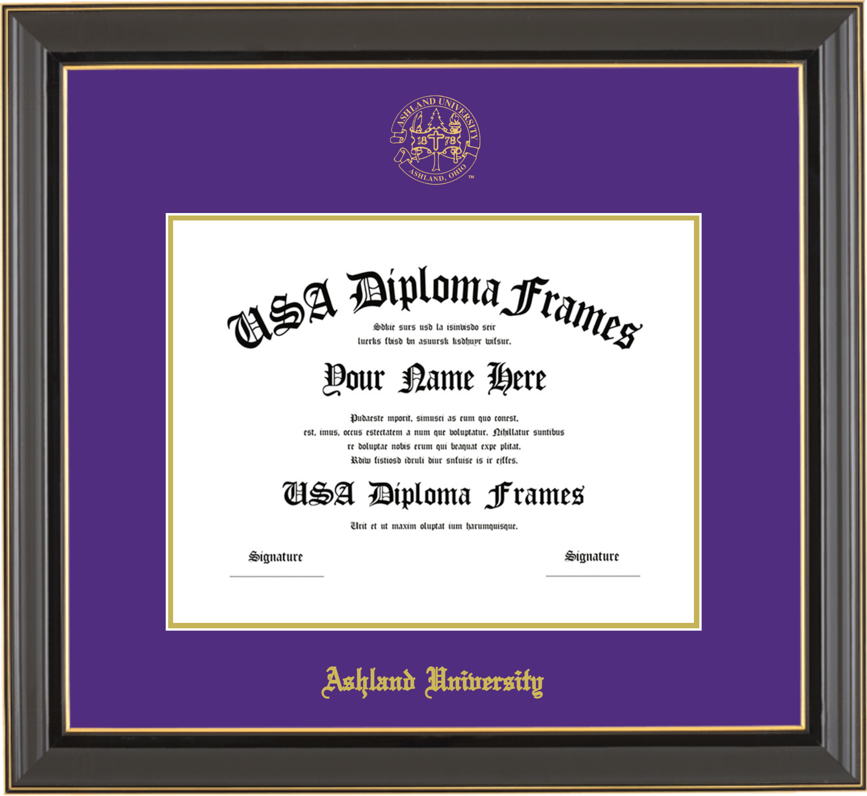 Ashland University Diploma Frame – Black Gold Trim Glossy – Purple and Gold Mat