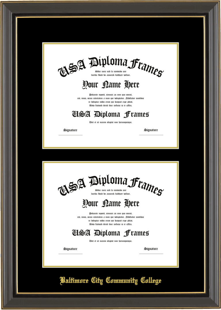 Baltimore City Community College Double Diploma Frame – Double Document – Black Gold Trim Glossy – Black and Gold Mat