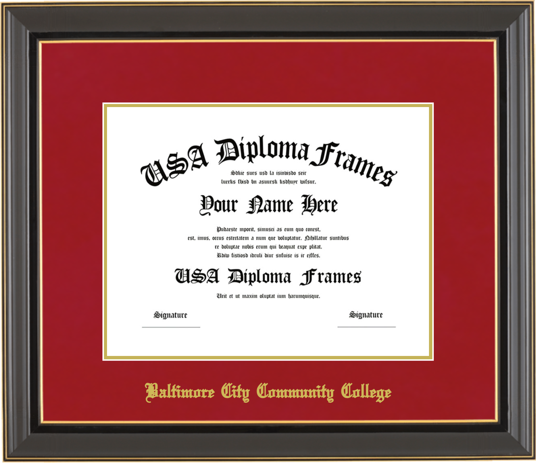 Baltimore City Community College Diploma Frame – Black Gold Trim Glossy – Crimson and Gold Mat