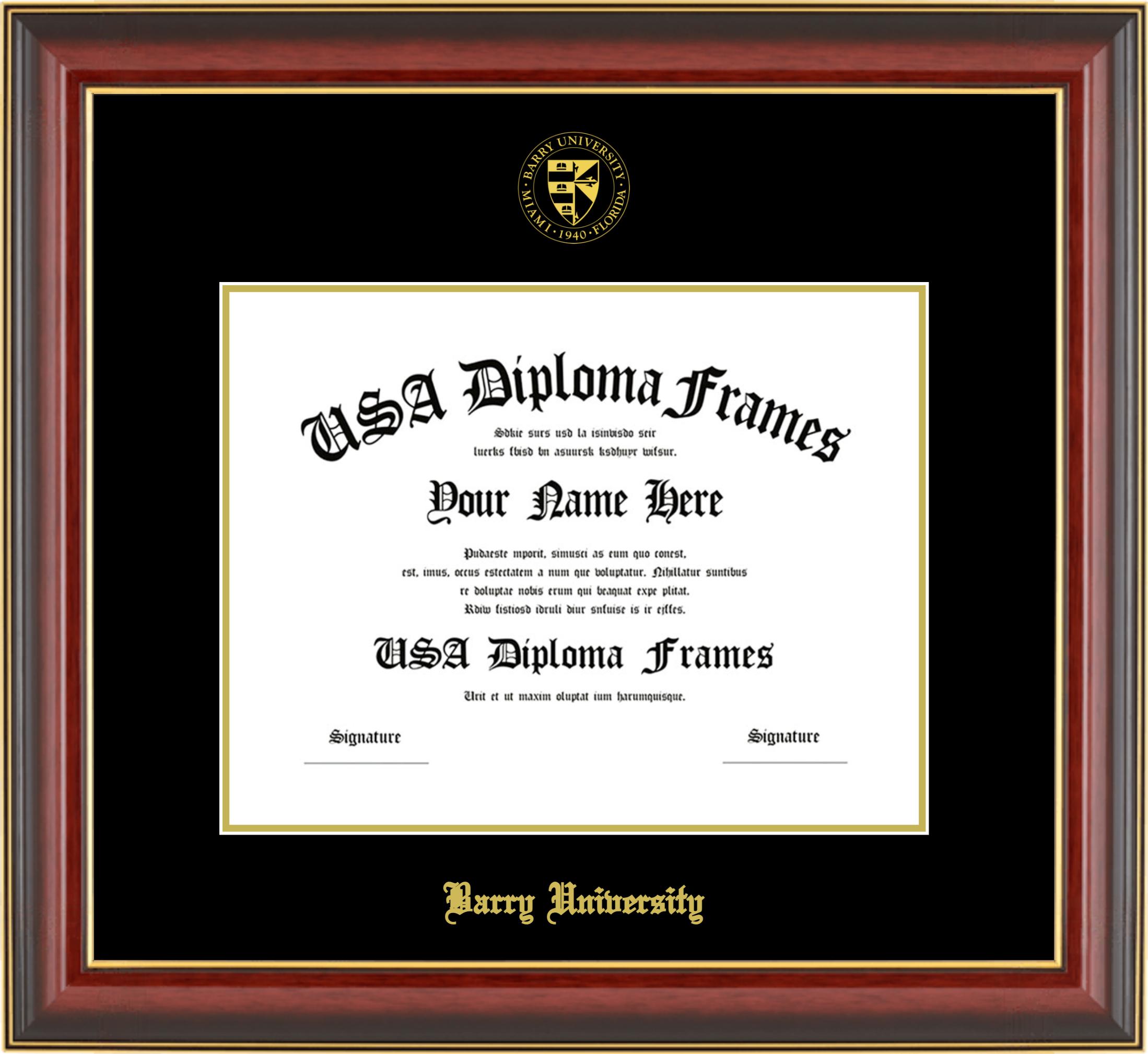 Barry University Diploma Frame – Cherry Mahogany Gold Trim Glossy – Black and Gold Mat