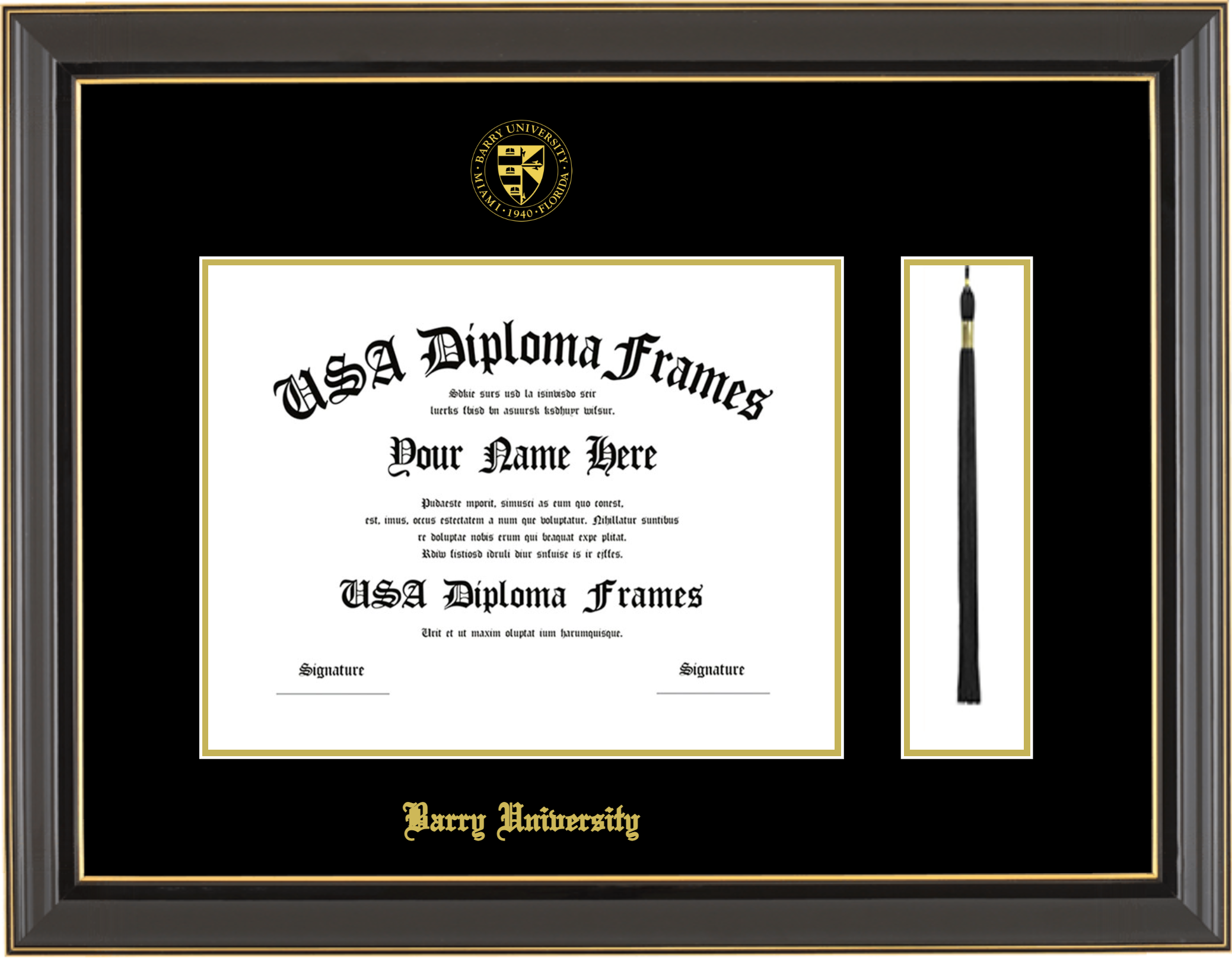 Barry University Diploma Frame with Tassel – Black Gold Trim Glossy – Black and Gold Mat