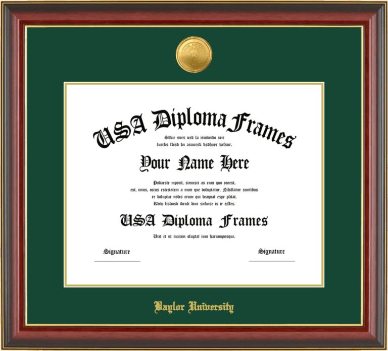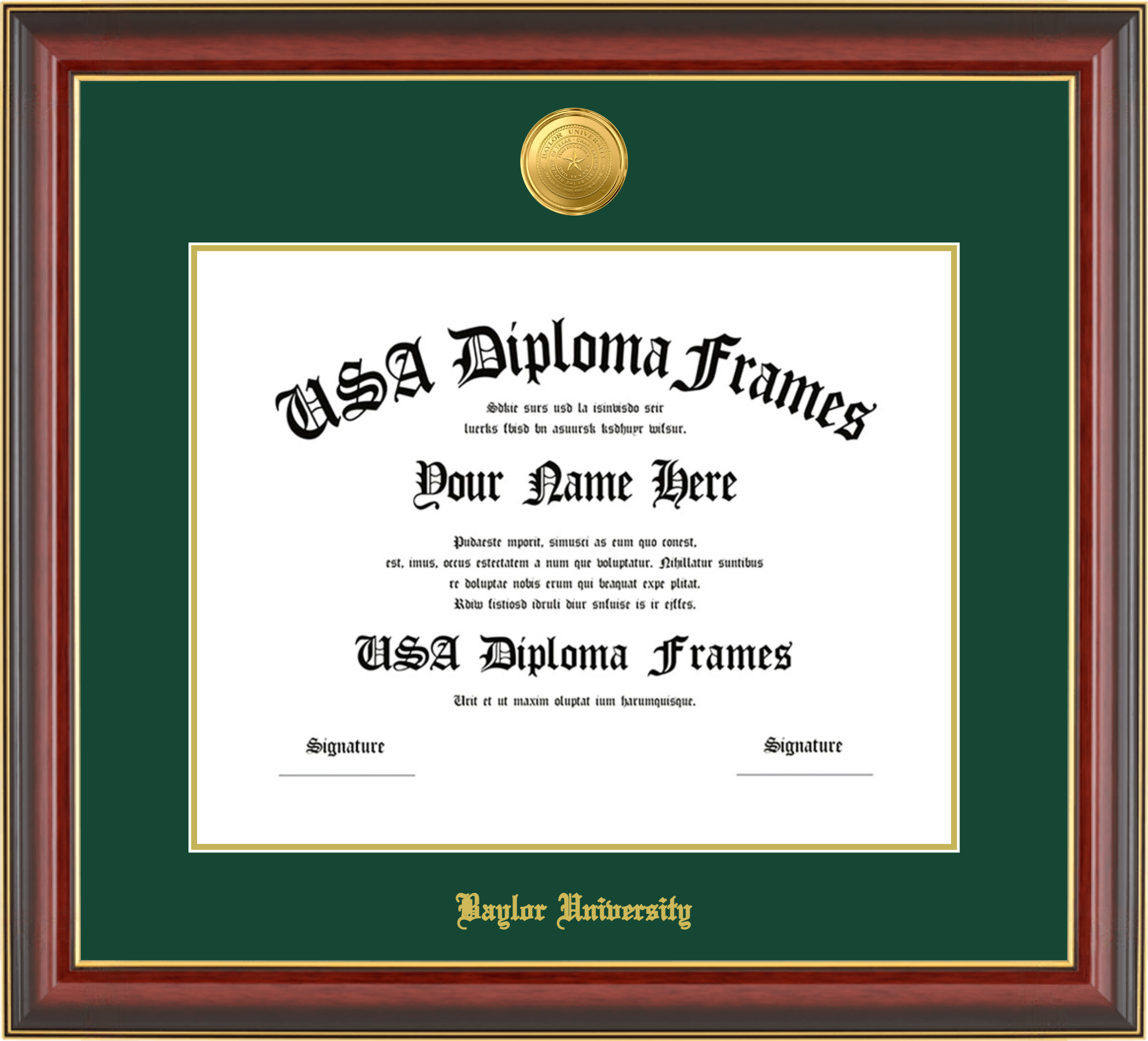 Baylor University Diploma Frame – Cherry Mahogany Gold Trim Glossy – Winter Green and Gold Mat – Medallion