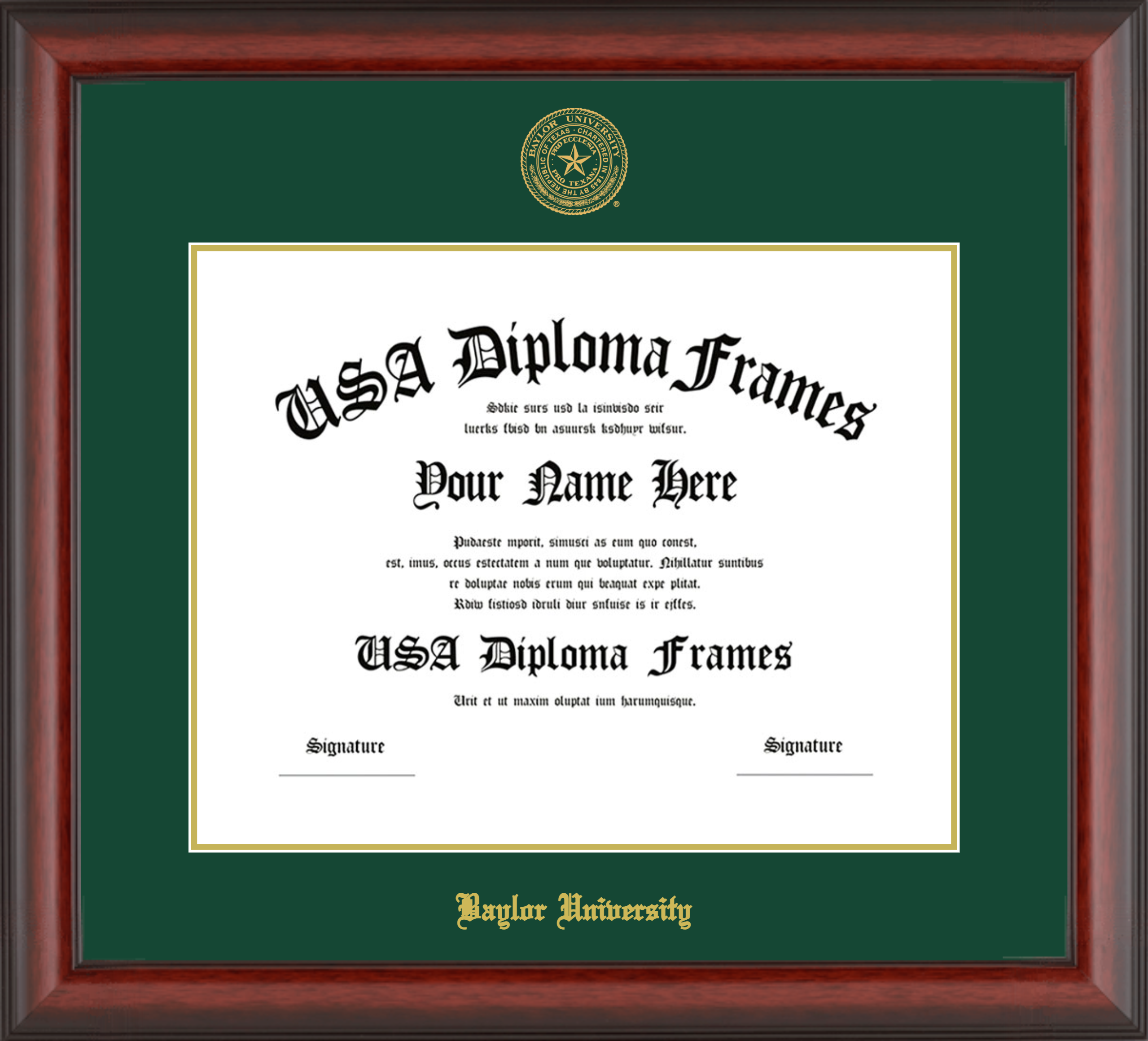 Baylor University Diploma Frame – Cherry Mahogany Matte – Winter Green and Gold Mat