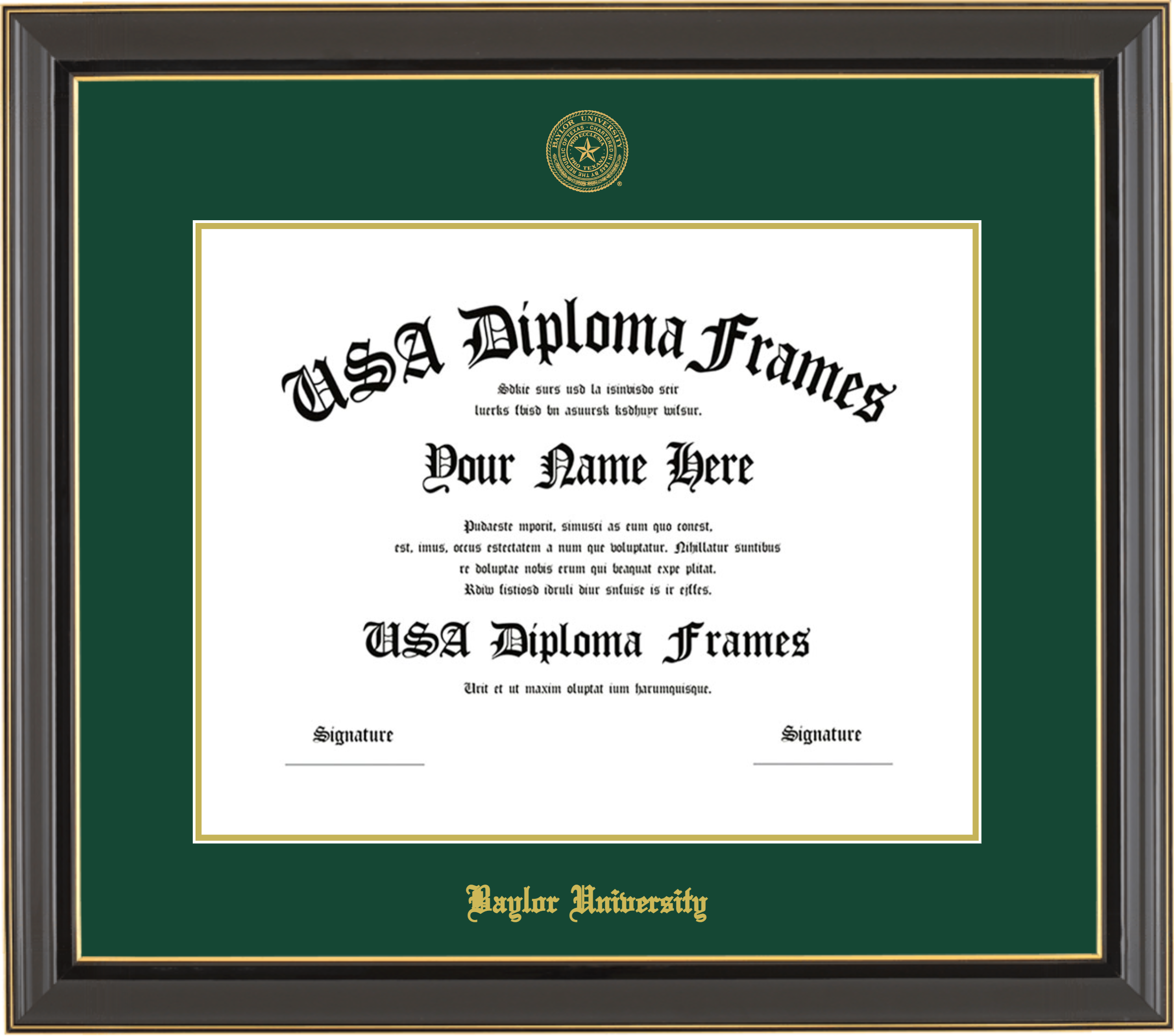 Baylor University – Single Horizontal Document ( Diploma ) – Black Gold Trim Glossy – Winter Green Mat – Gold Accent Mat – With Seal(University Seal Gold) – With Gold Embossing (Baylor University)