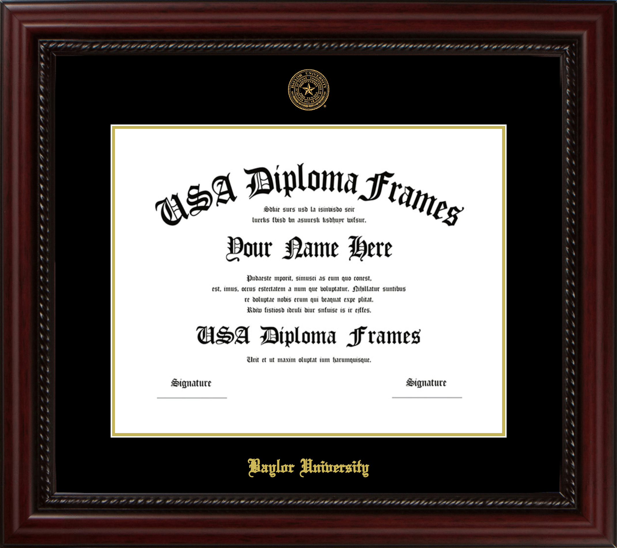 Baylor University Diploma Frame – Executive Cherry Rope – Black and Gold Mat