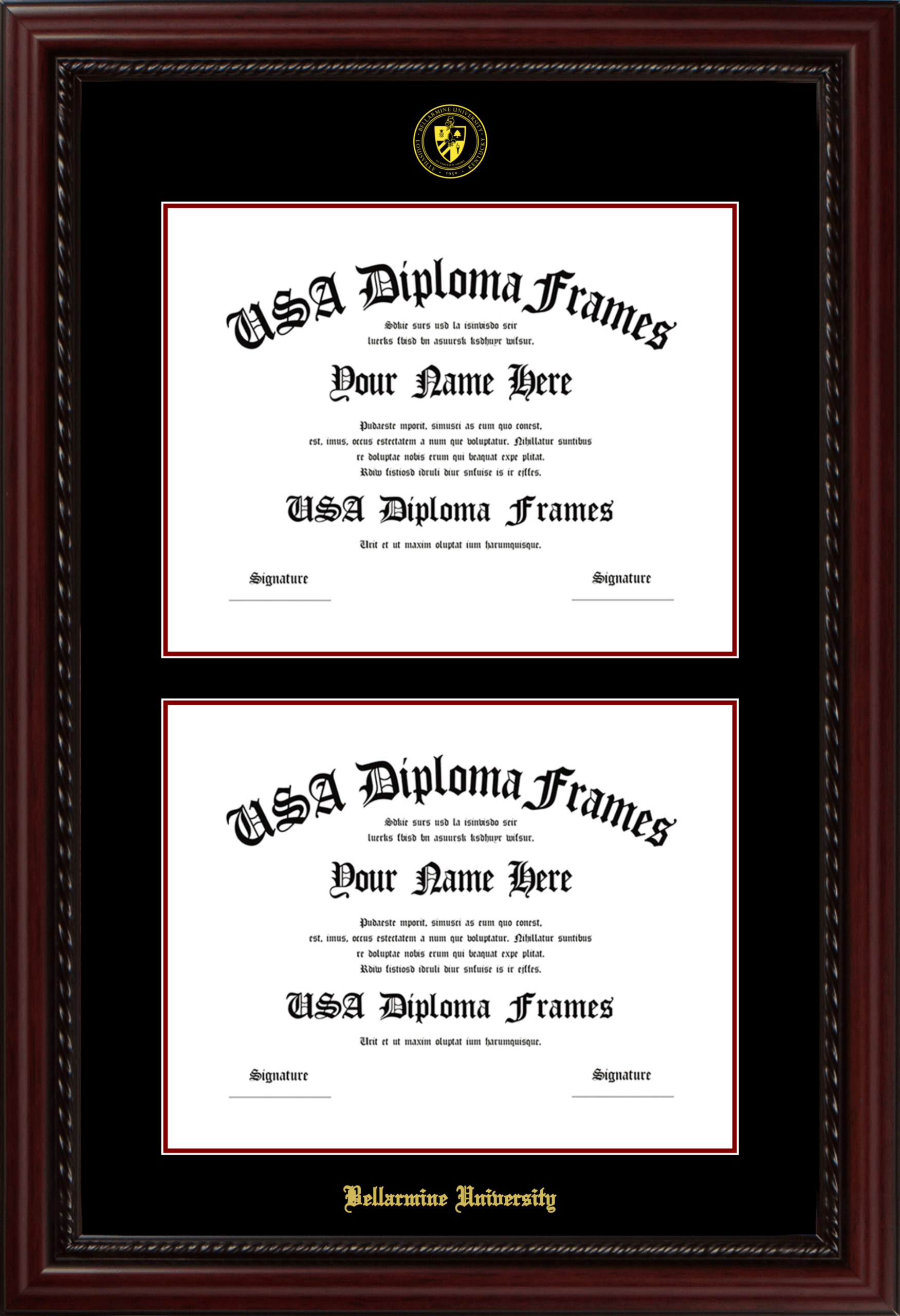 Bellarmine University Double Diploma Frame – Double Document – Executive Cherry Rope – Black and Maroon Mat