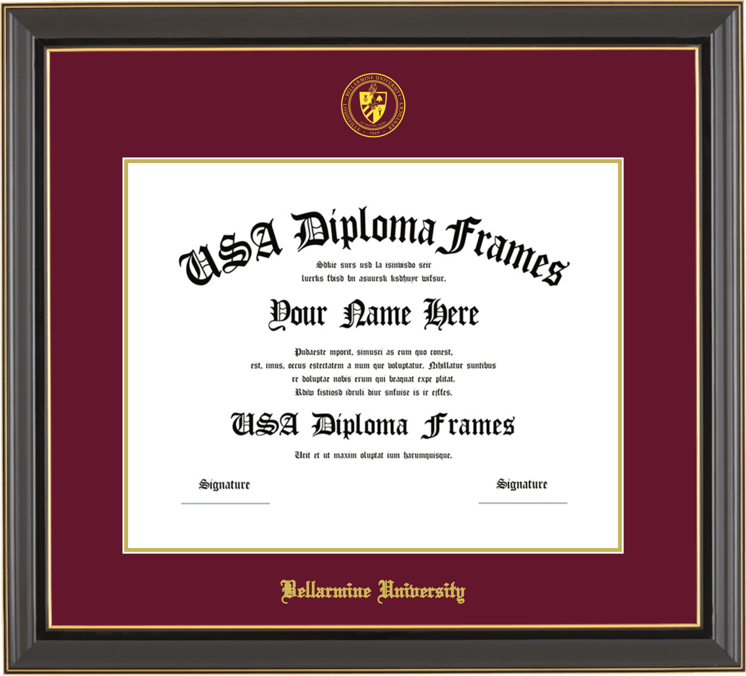 Bellarmine University – Single Horizontal Document ( Diploma ) – Black Gold Trim Glossy – Maroon Mat – Gold Accent Mat – With Seal(University Seal Gold) – With Gold Embossing (Bellarmine University)