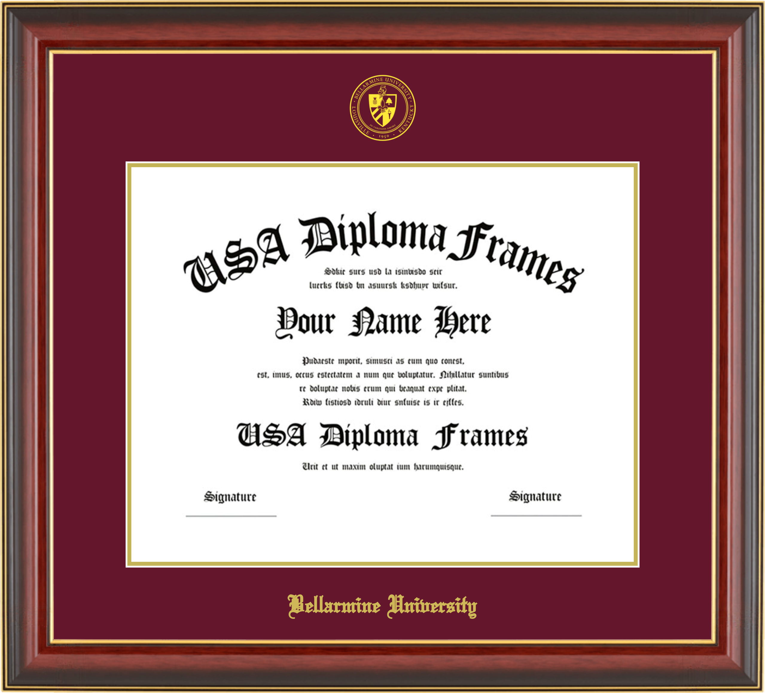 Bellarmine University – Single Horizontal Document ( Diploma ) – Cherry Mahogany Gold Trim Glossy – Maroon Mat – Gold Accent Mat – With Seal(University Seal Gold) – With Gold Embossing (Bellarmine University)