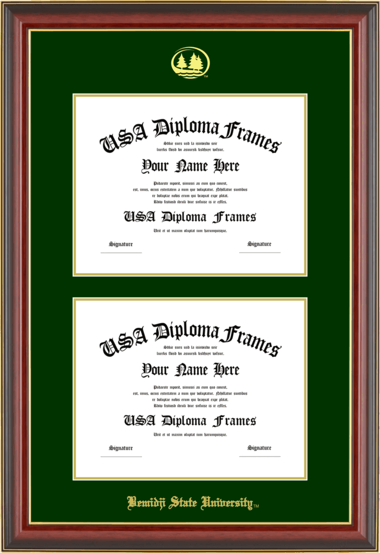 Bemidji State University Double Diploma Frame – Double Document – Cherry Mahogany Gold Trim Glossy – Winter Green and Gold Mat
