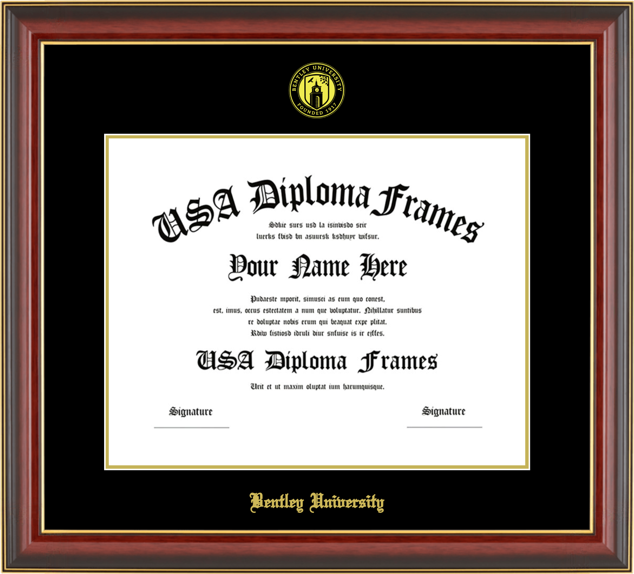 Bentley University Diploma Frame – Cherry Mahogany Gold Trim Glossy – Black and Gold Mat