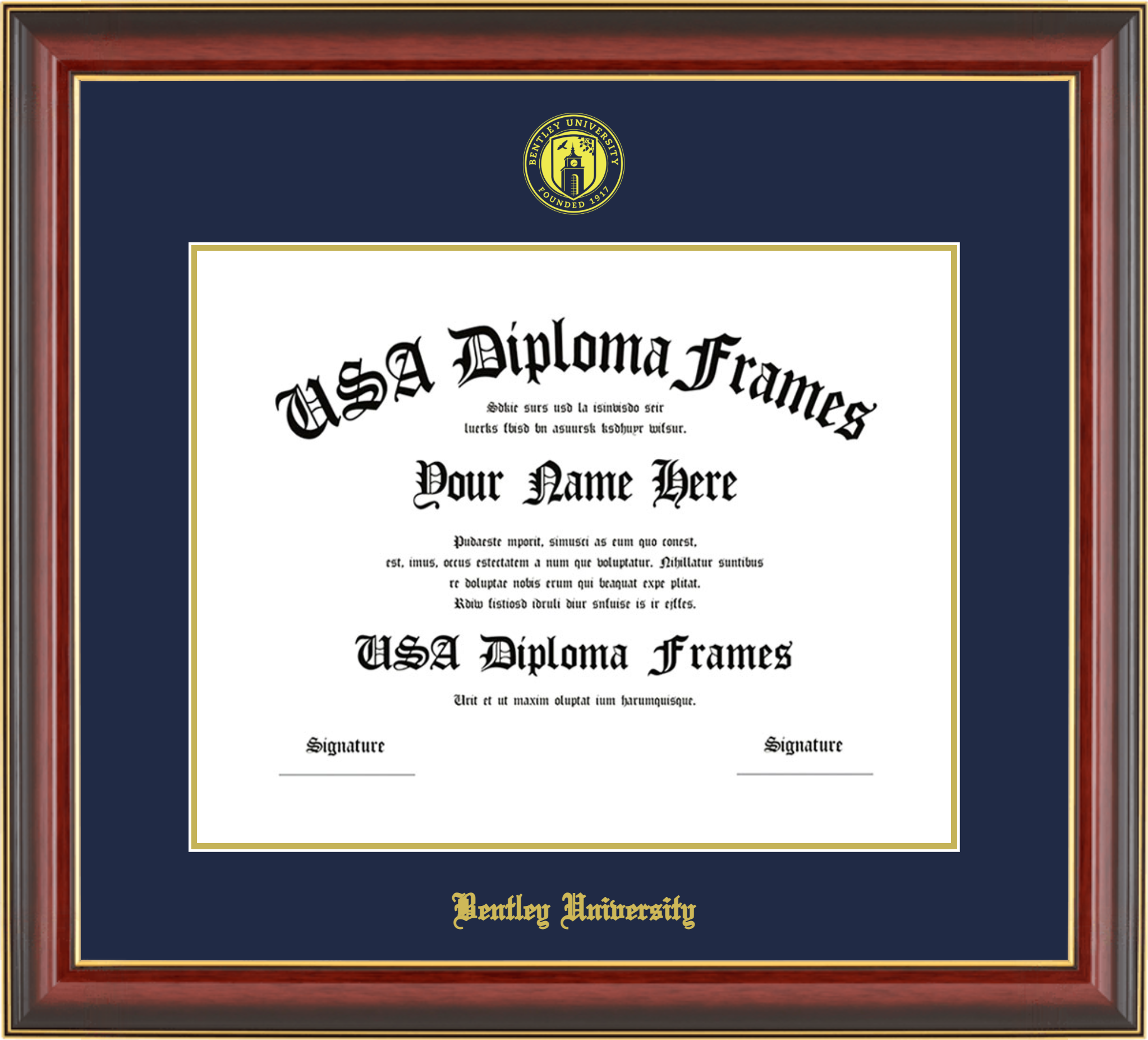 Bentley University – Single Horizontal Document ( Diploma ) – Cherry Mahogany Gold Trim Glossy – Navy Mat – Gold Accent Mat – With Seal(University Seal Gold) – With Gold Embossing (Bentley University)