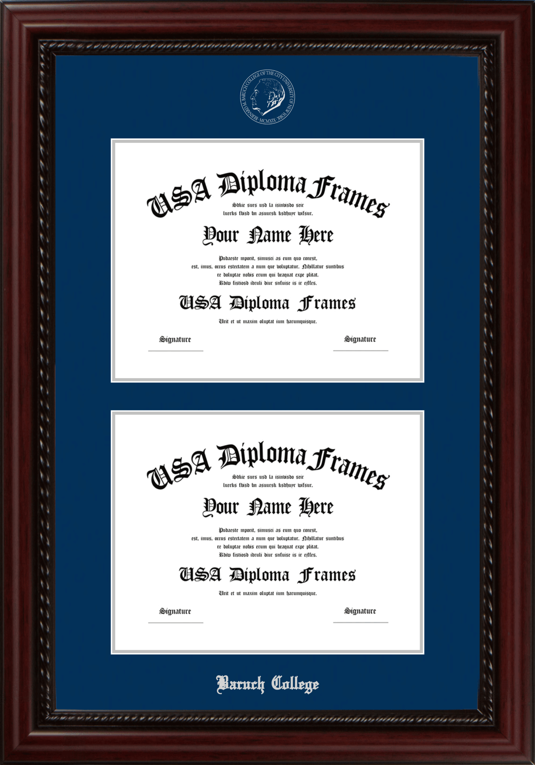 Bernard M. Baruch College of the City University of New York – Double Document Vertically ( 8 1/2″x11″ , 8 1/2″x11″ ) – Executive Cherry Rope – Navy Mat – Silver Accent Mat – With Seal(University Seal Silver) – With Silver Embossing (Baruch College)