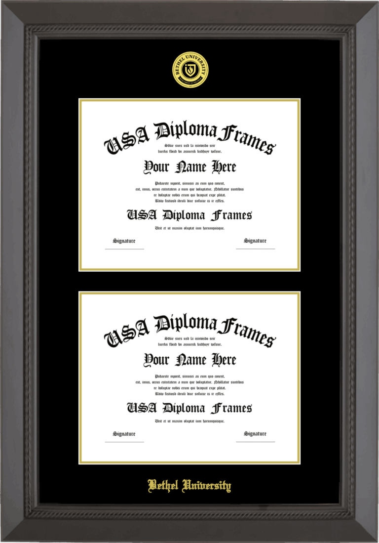 Bethel University Indiana Double Diploma Frame – Double Document – Black Rope – Black and Gold Mat