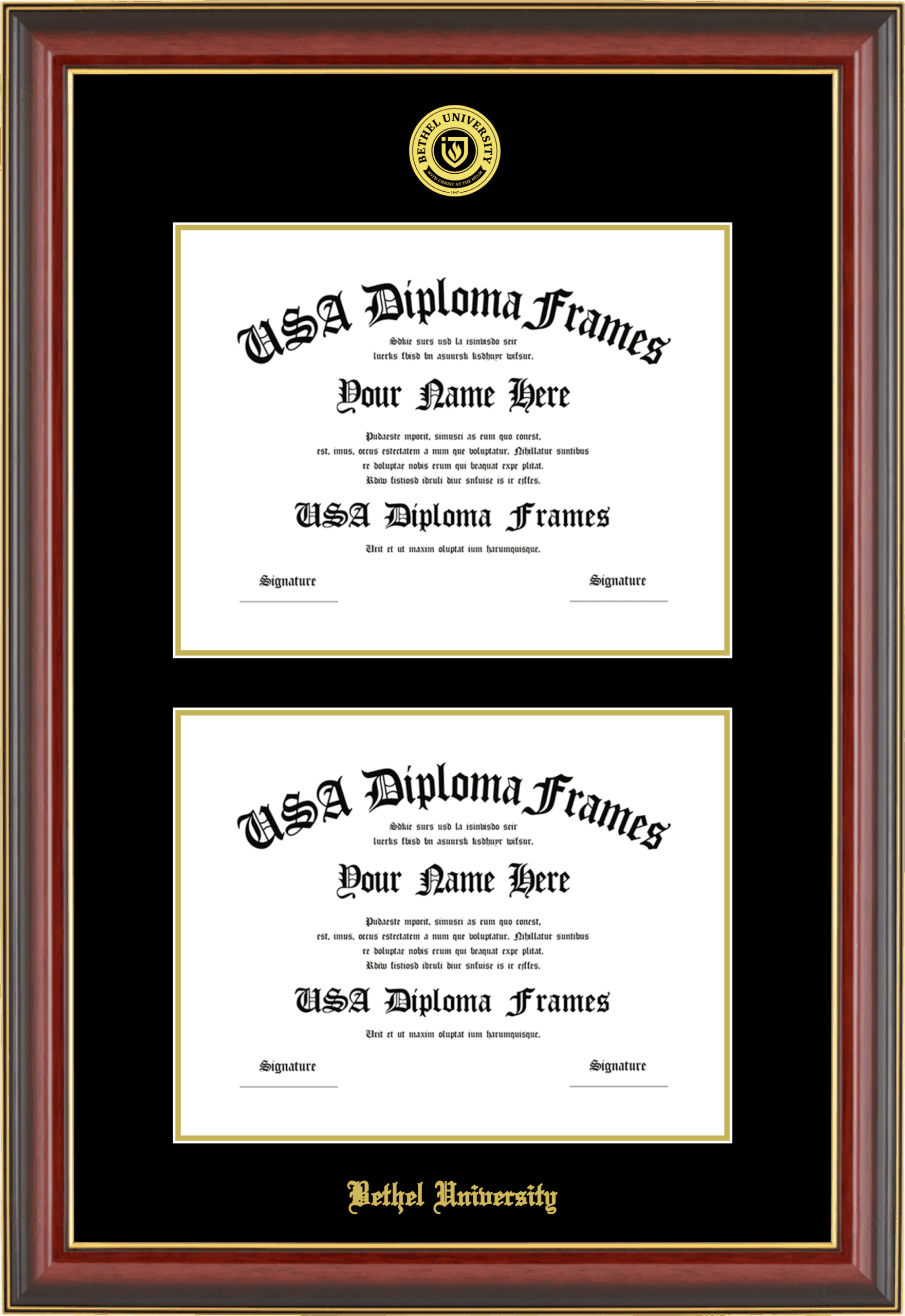 Bethel University Indiana Double Diploma Frame – Double Document – Cherry Mahogany Gold Trim Glossy – Black and Gold Mat