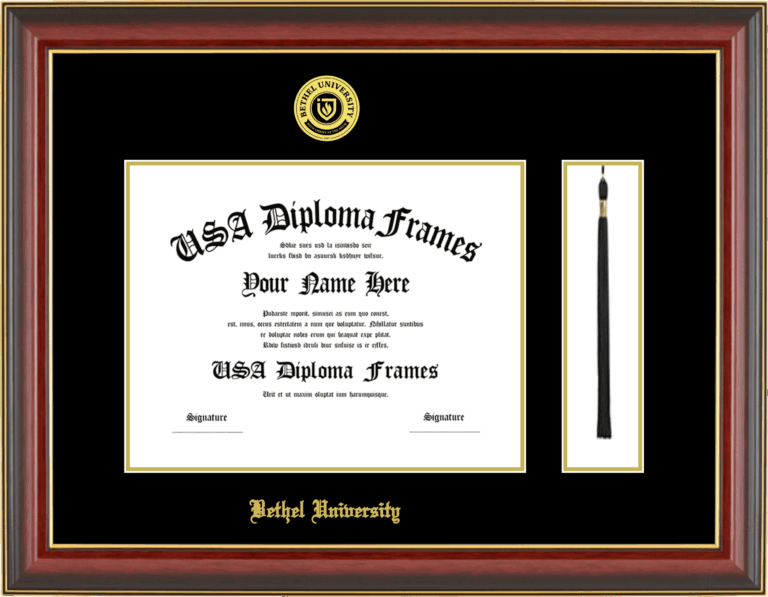 Bethel University Diploma Frame with Tassel – Cherry Mahogany Gold Trim Glossy – Black and Gold Mat