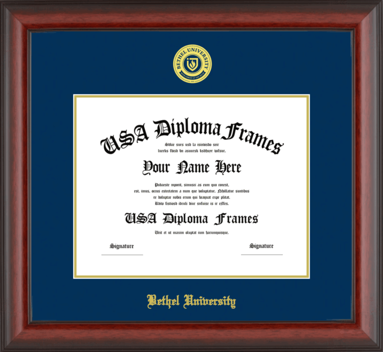 Bethel University Diploma Frame – Cherry Mahogany Matte – Navy and Gold Mat