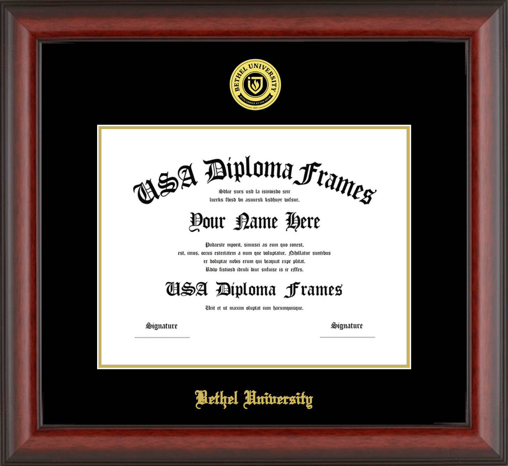 Bethel University Diploma Frame – Cherry Mahogany Matte – Black and Gold Mat