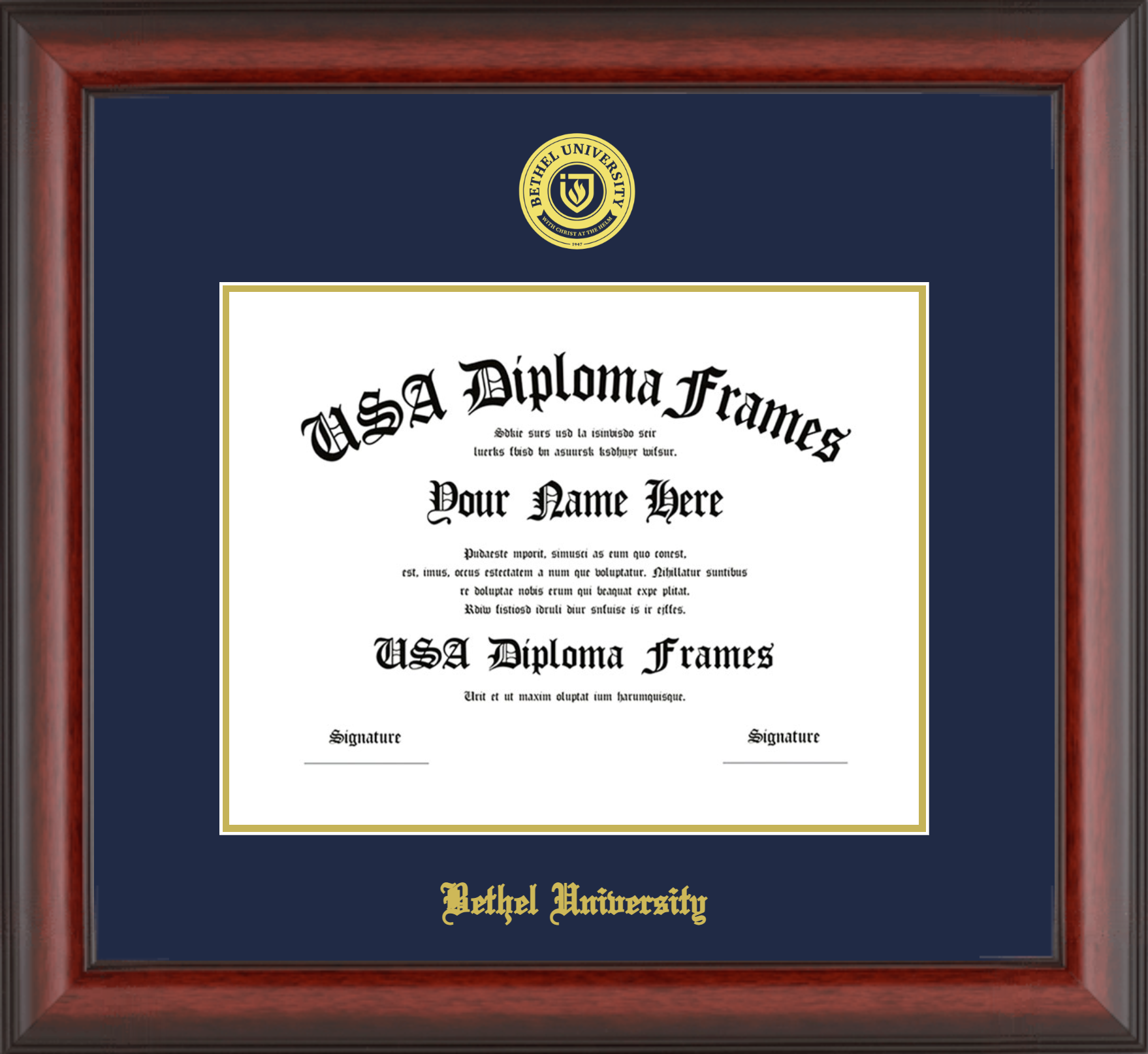 Bethel University – Single Horizontal Document ( Diploma ) – Cherry Mahogany Matte – Navy Mat – Gold Accent Mat – With Seal(University Seal Gold) – With Gold Embossing (Bethel University)