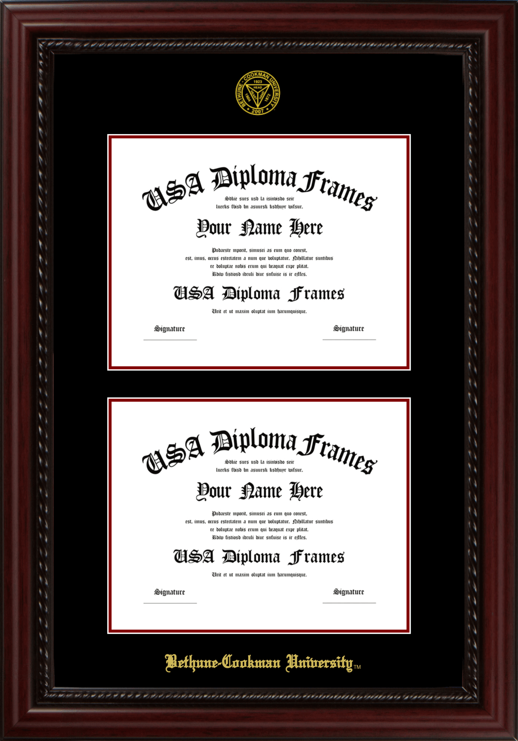 Bethune-Cookman University Double Diploma Frame – Double Document – Executive Cherry Rope – Black and Maroon Mat