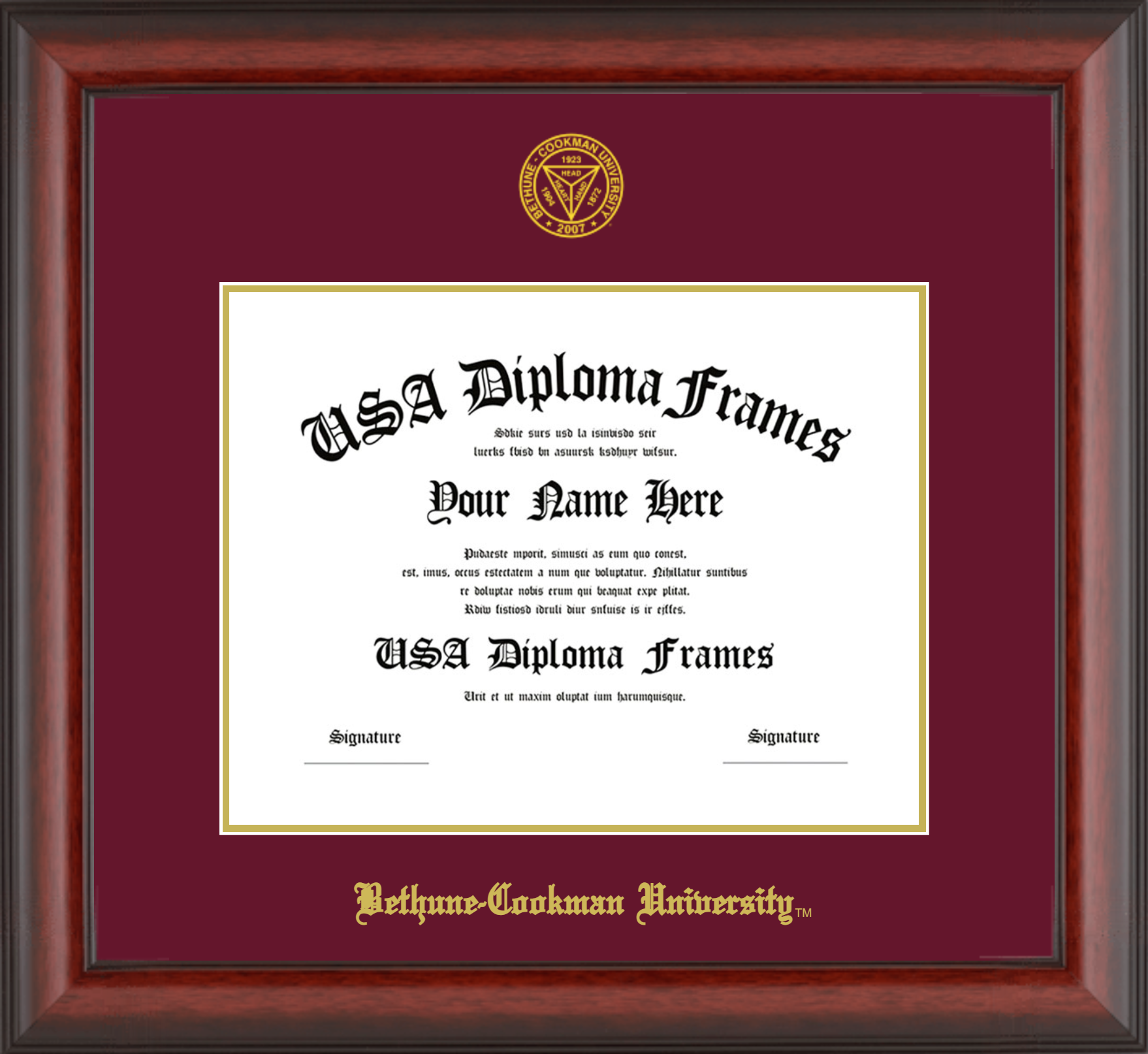 Bethune-Cookman University – Single Horizontal Document ( Bachelors ) – Cherry Mahogany Matte – Maroon Mat – Gold Accent Mat – With Seal(University Seal Gold) – With Gold Embossing (Bethune-Cookman University)