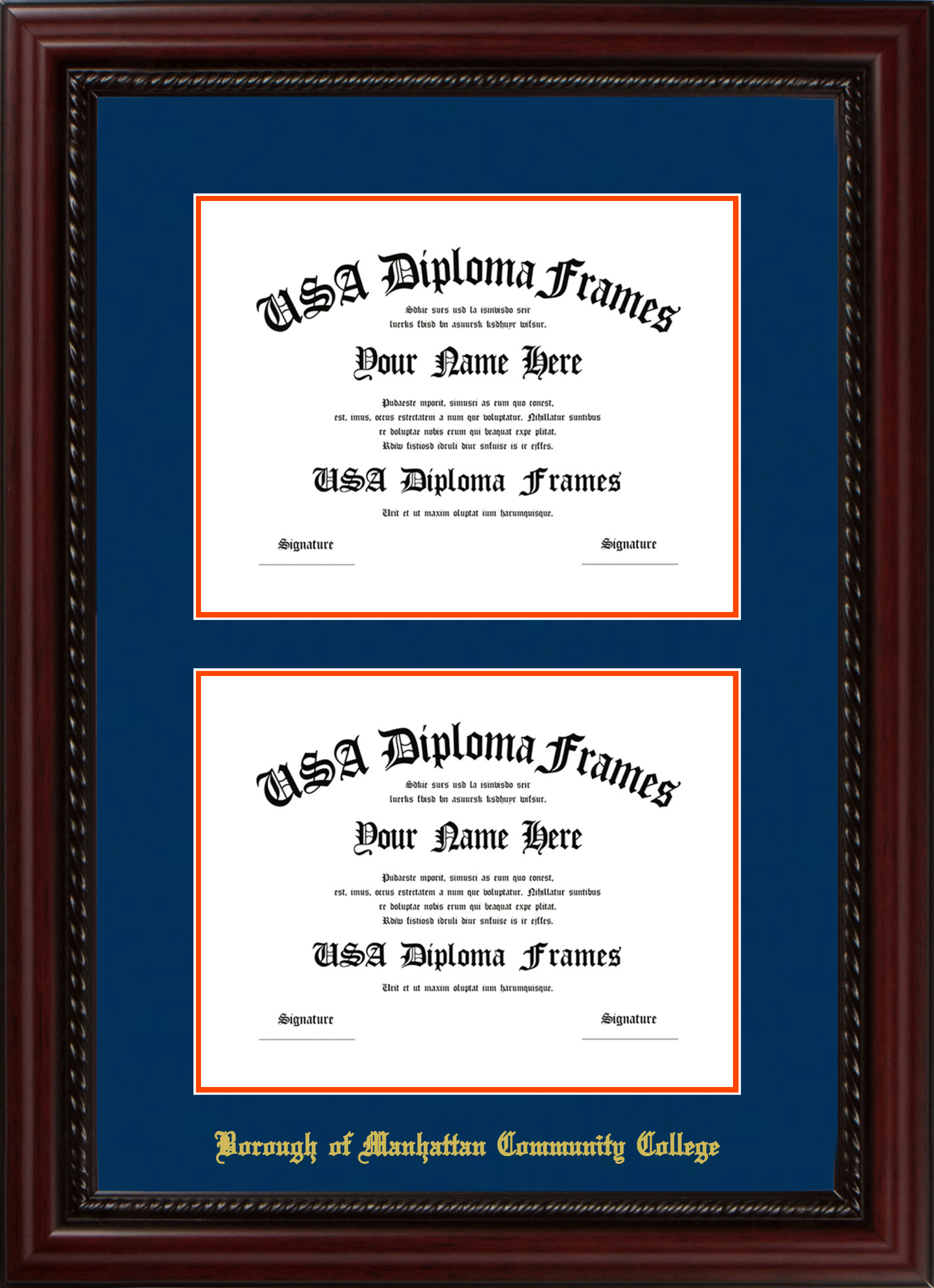 Borough of Manhattan Community College of the City University of New York Double Diploma Frame – Double Document – Executive Cherry Rope – Navy and Orange Mat