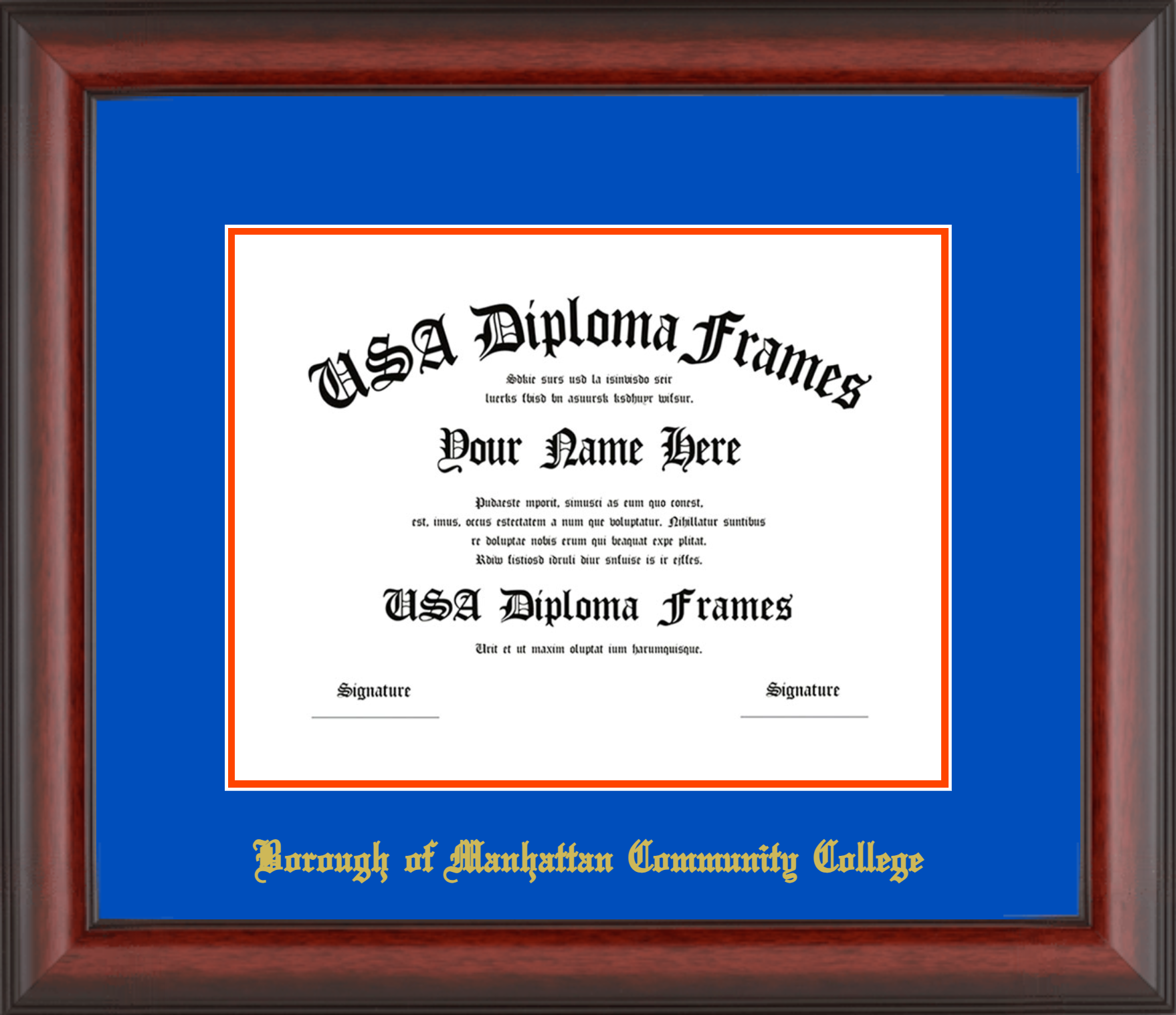 Borough of Manhattan Community College of the City University of New York Diploma Frame- Cherry Mahogany Matte – Royal Blue and Orange Mat