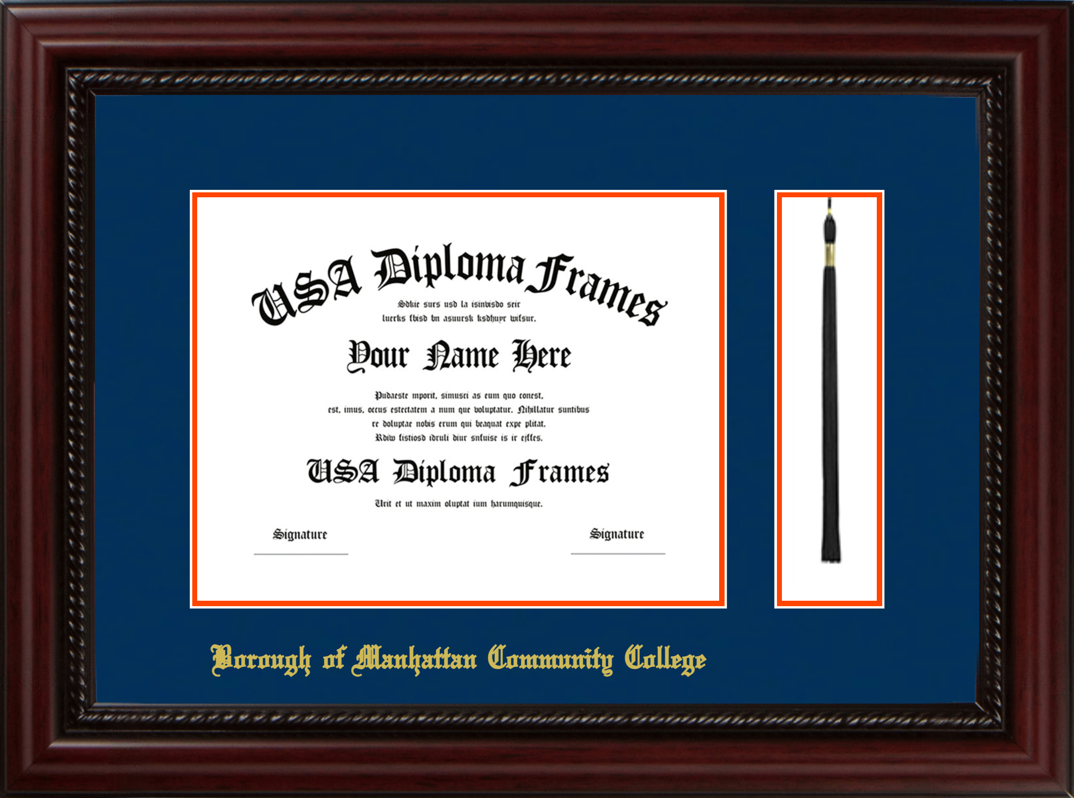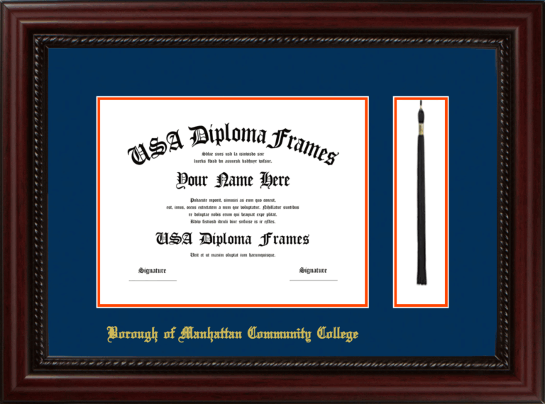 Borough of Manhattan Community College of the City University of New York Diploma Frame with Tassel – Executive Cherry Rope – Navy and Orange Mat