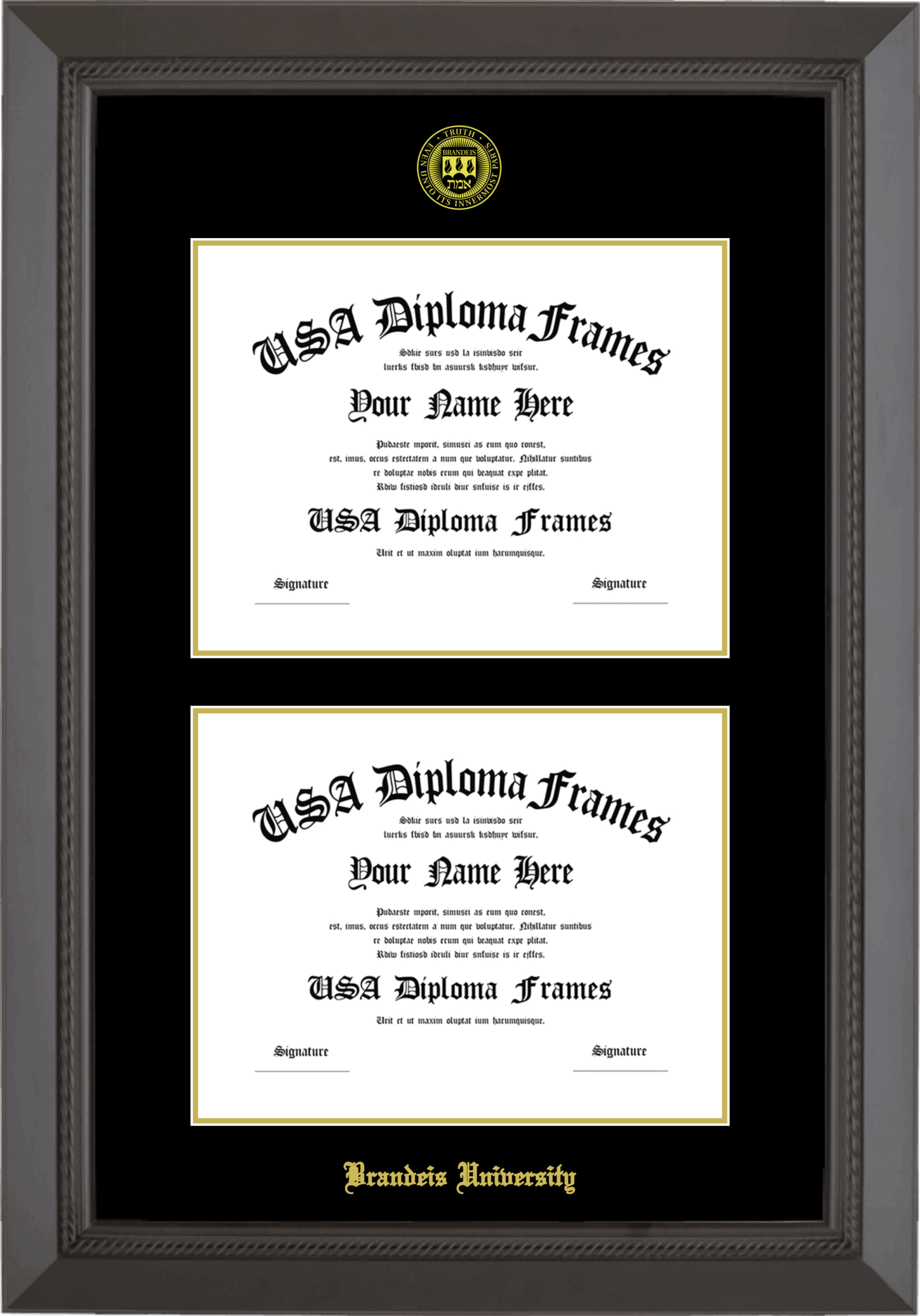 Brandeis University Double Diploma Frame – Double Document – Black Rope – Black and Gold Mat