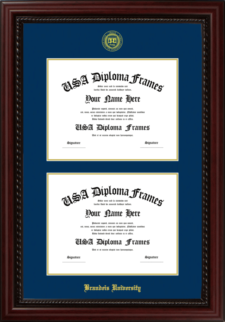 Brandeis University Double Diploma Frame – Double Document – Executive Cherry Rope – Navy and Gold Mat