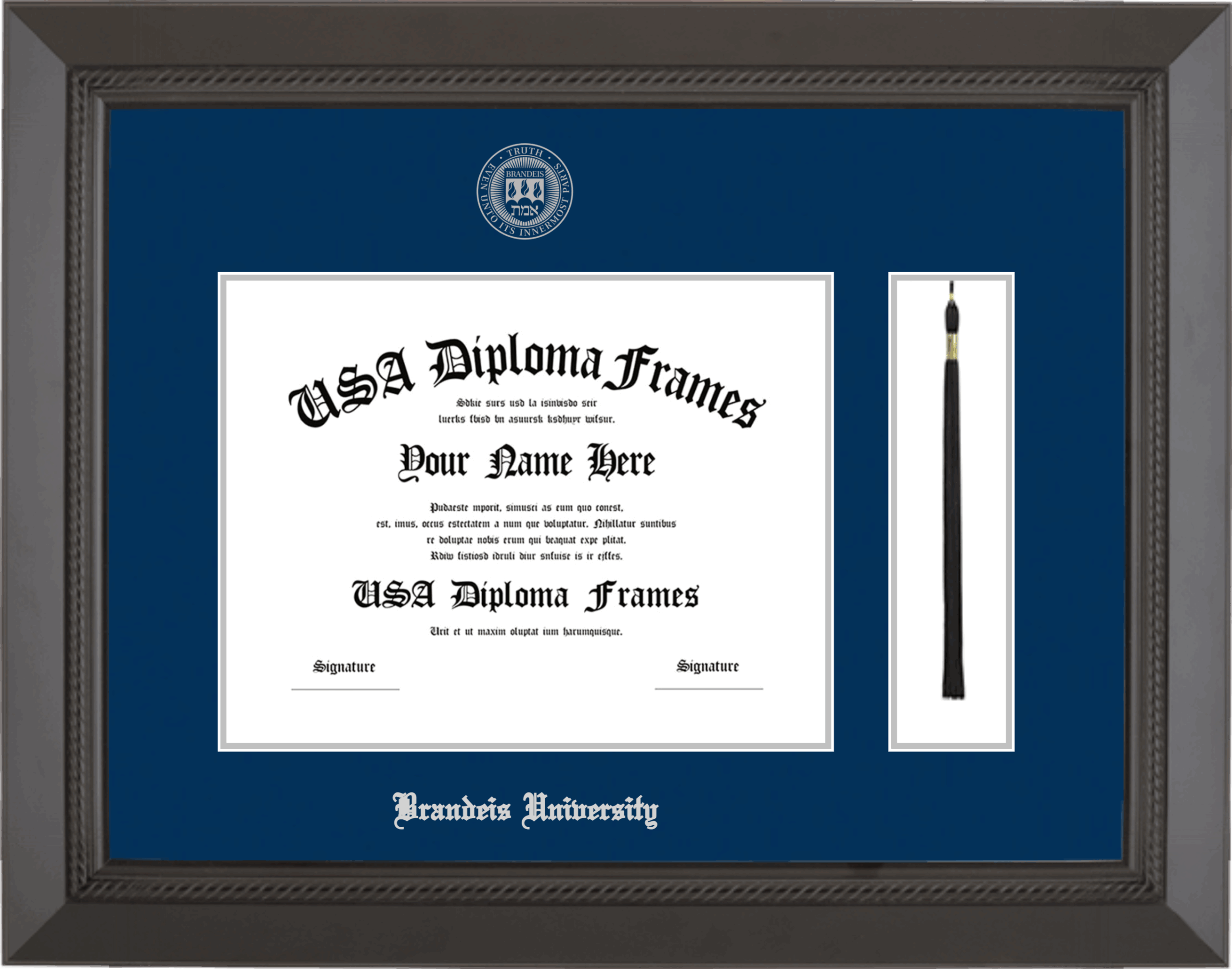 Brandeis University Diploma Frame with Tassel – Black Rope – Navy and Silver Mat