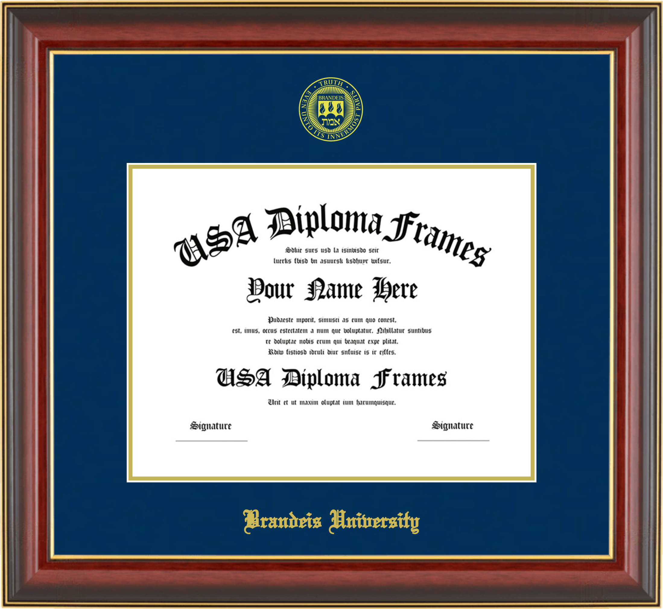 Brandeis University Diploma Frame – Cherry Mahogany Gold Trim Glossy – Navy and Gold Mat
