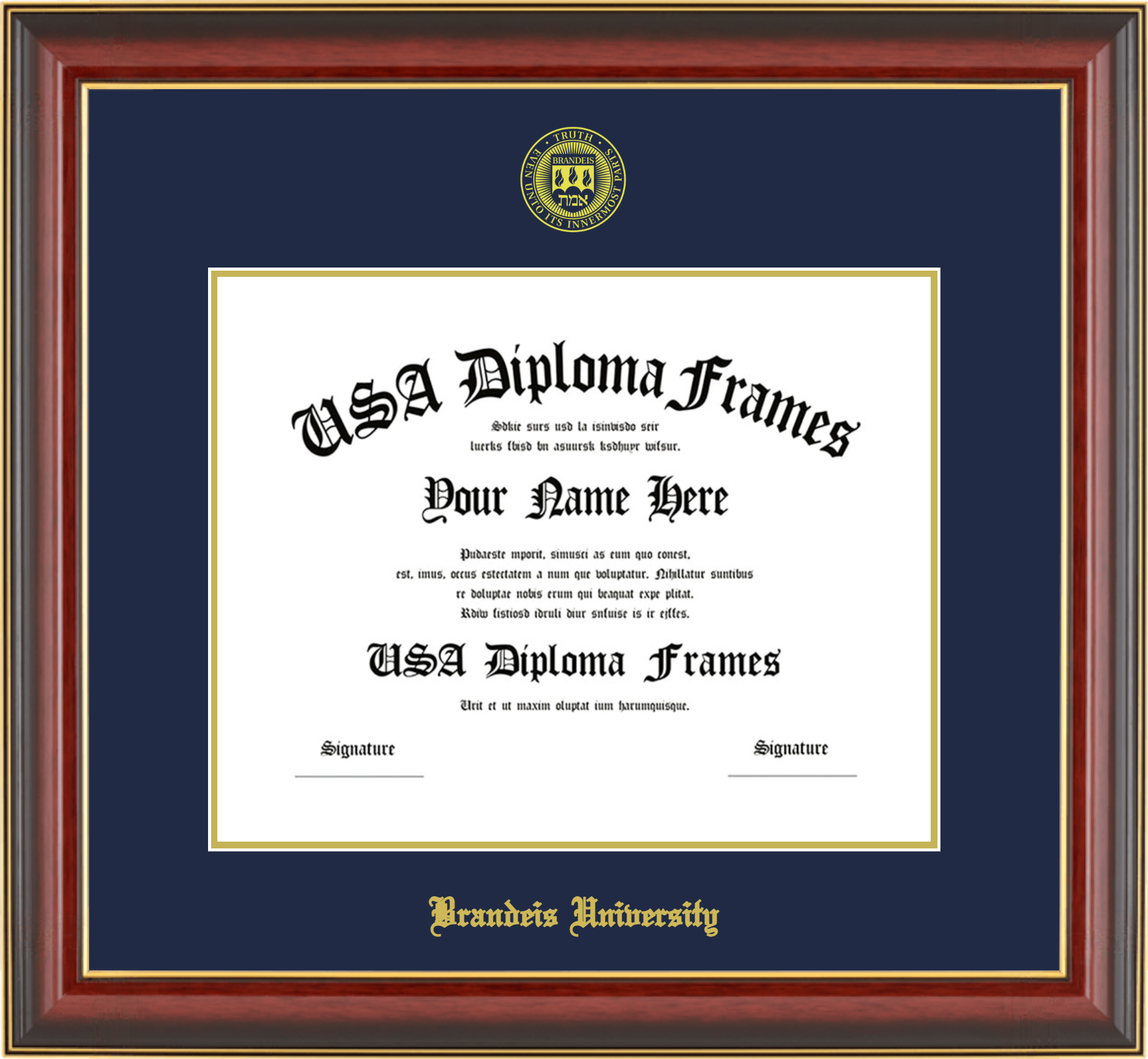 Brandeis University – Single Horizontal Document ( Diploma ) – Cherry Mahogany Gold Trim Glossy – Navy Mat – Gold Accent Mat – With Seal(University Seal Gold) – With Gold Embossing (Brandeis University)