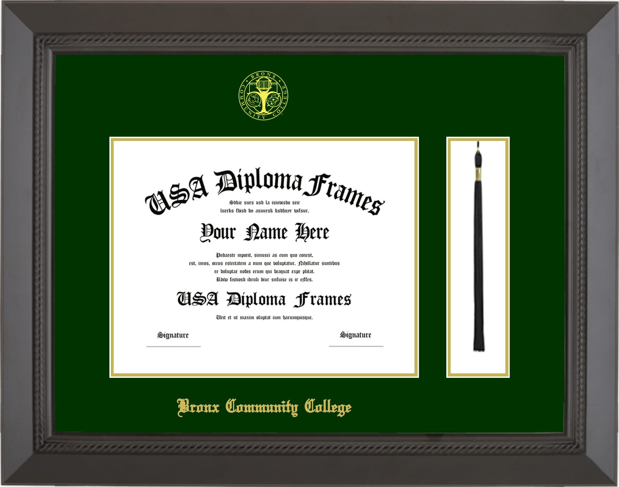Bronx Community College Diploma Frame with Tassel – Black Rope – Winter Green and Gold Mat
