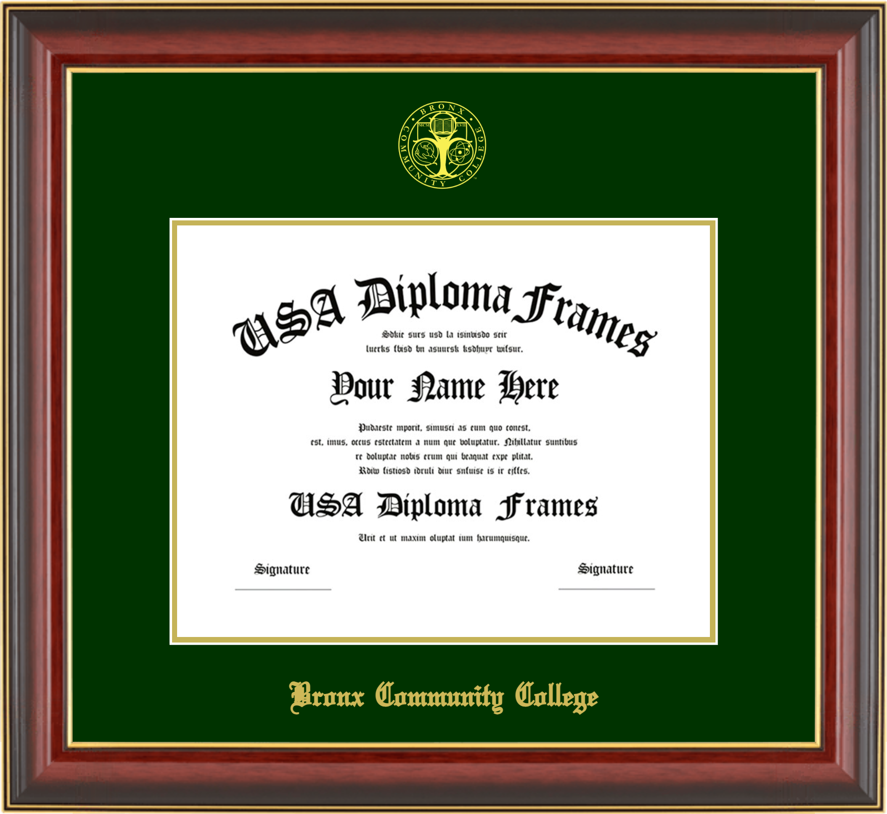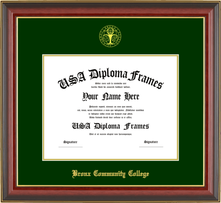 Bronx Community College Diploma Frame – Cherry Mahogany Gold Trim Glossy – Winter Green and Gold Mat