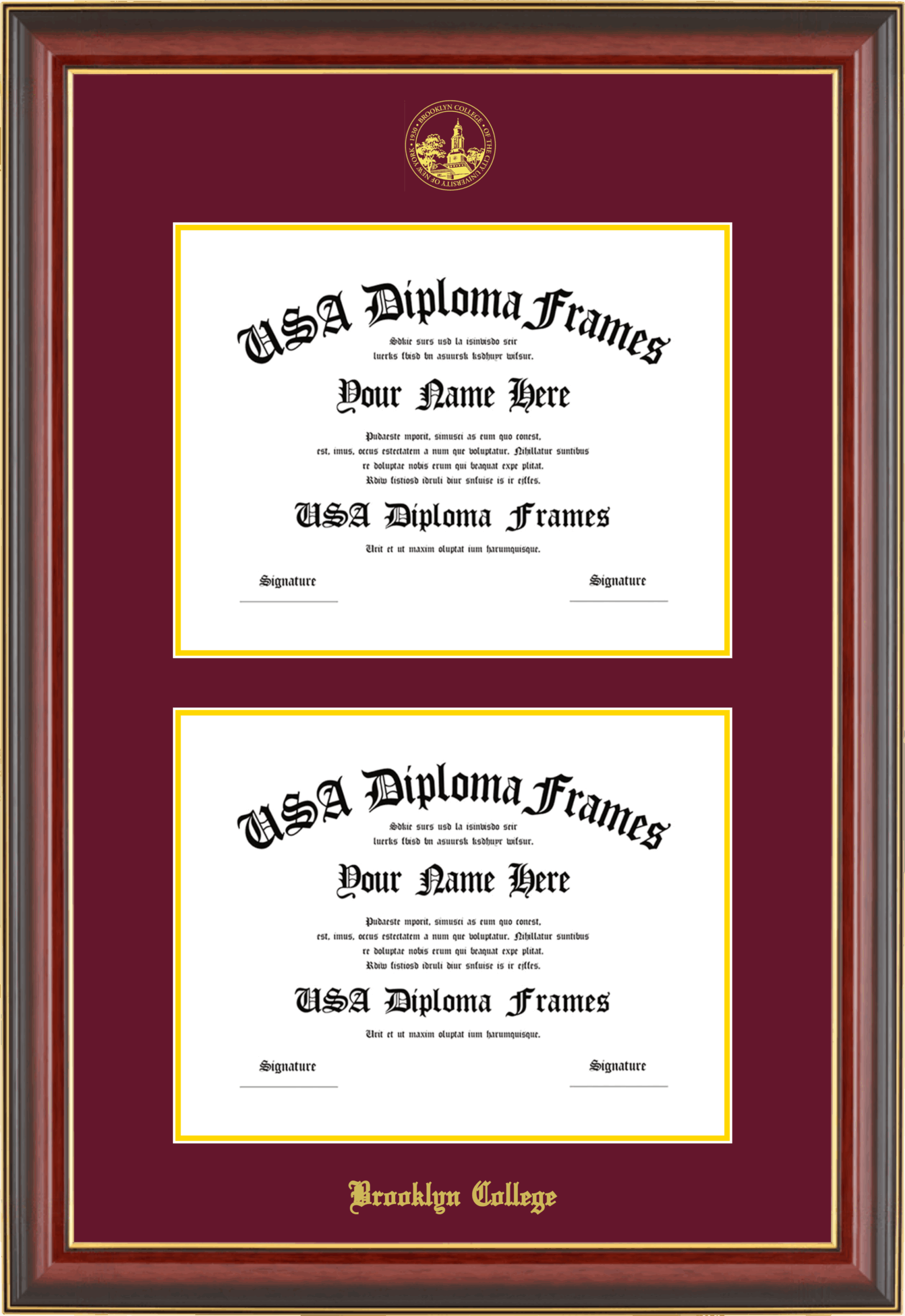 Brooklyn College of the City University of New York Double Diploma Frame – Double Document – Cherry Mahogany Gold Trim Glossy – Maroon and Yellow Gold Mat