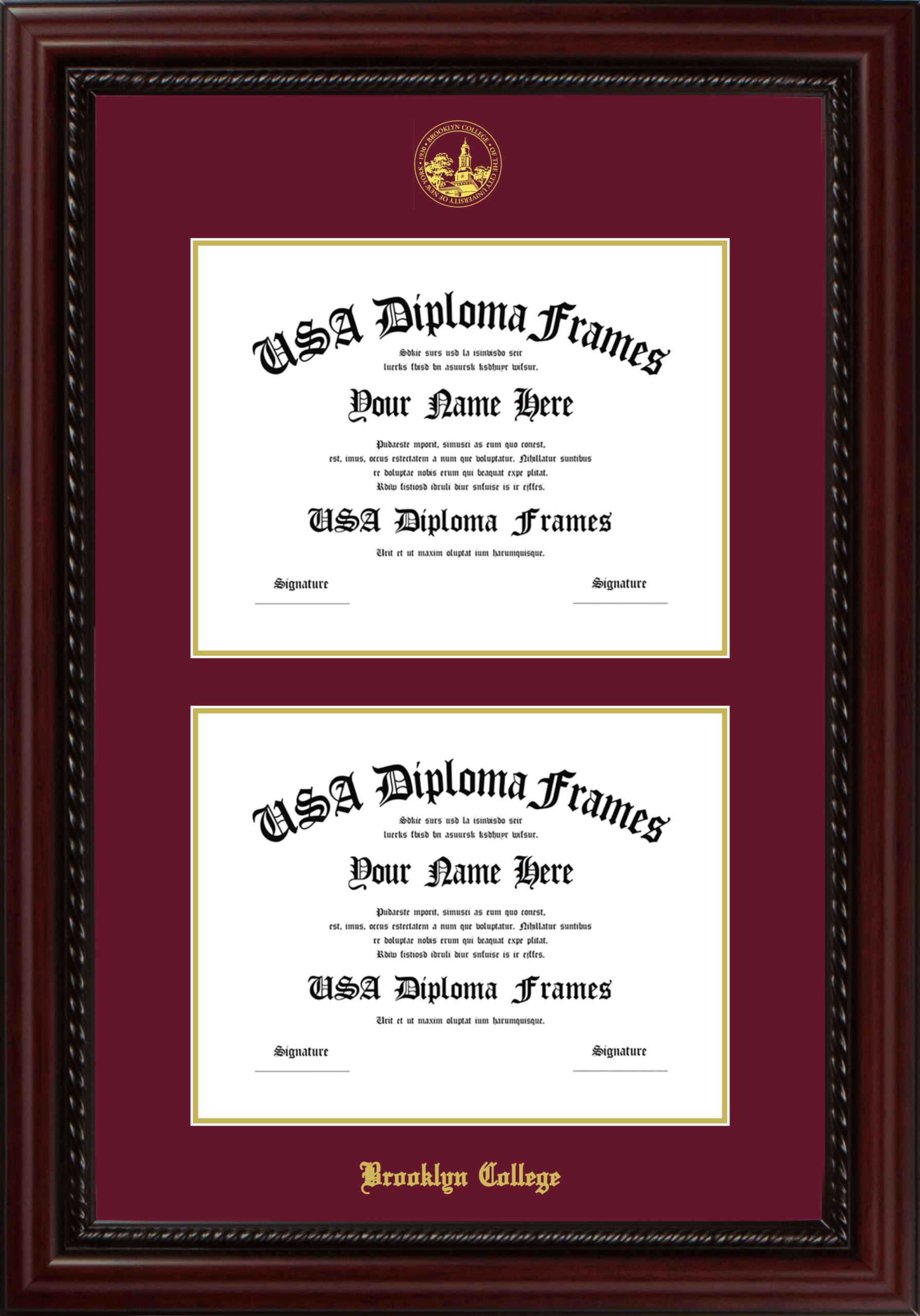 Brooklyn College of the City University of New York Double Diploma Frame – Double Document – Executive Cherry Rope – Maroon and Gold Mat