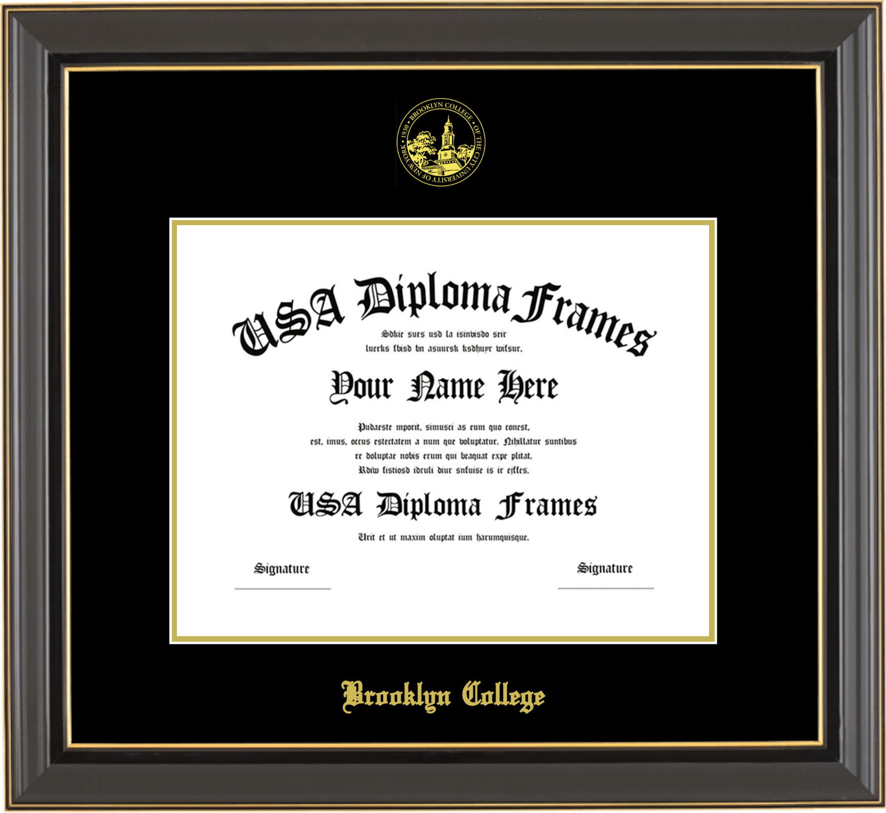 Brooklyn College Diploma Frame – Black Gold Trim Glossy – Black and Gold Mat