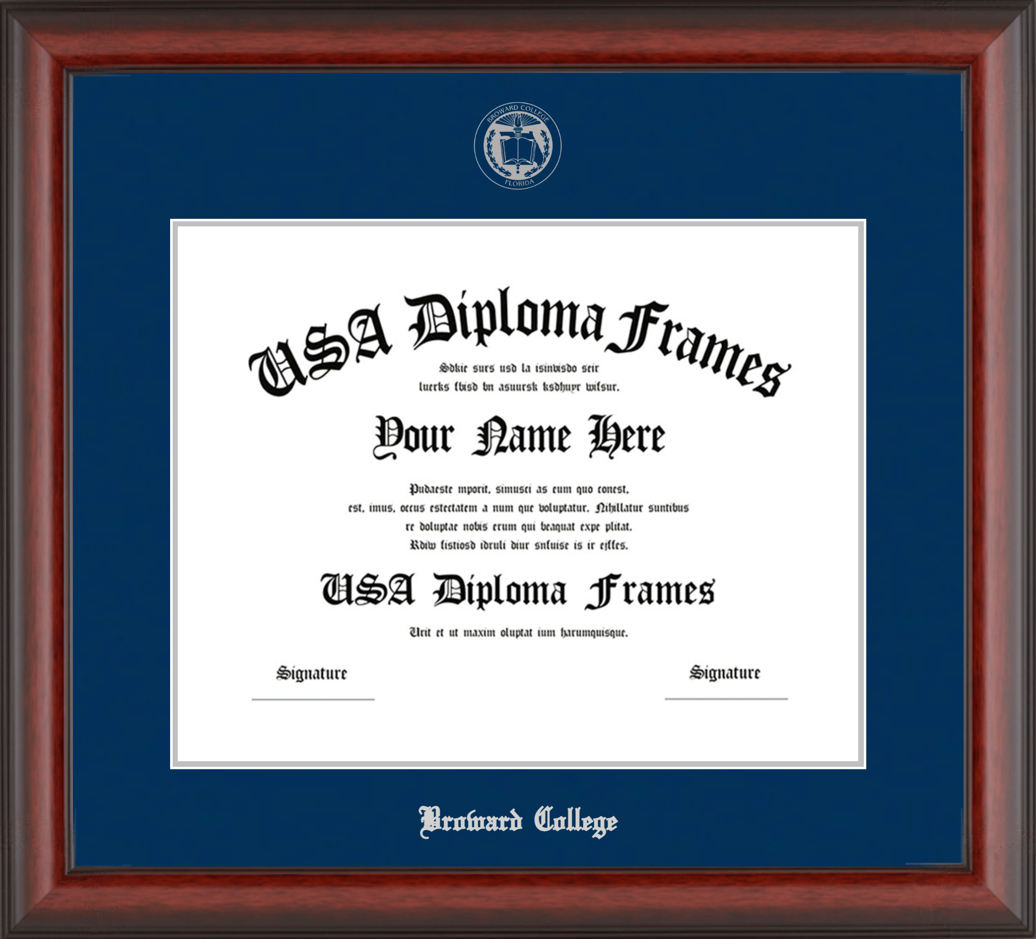 Broward College Diploma Frame – Cherry Mahogany Matte – Navy and Silver Mat