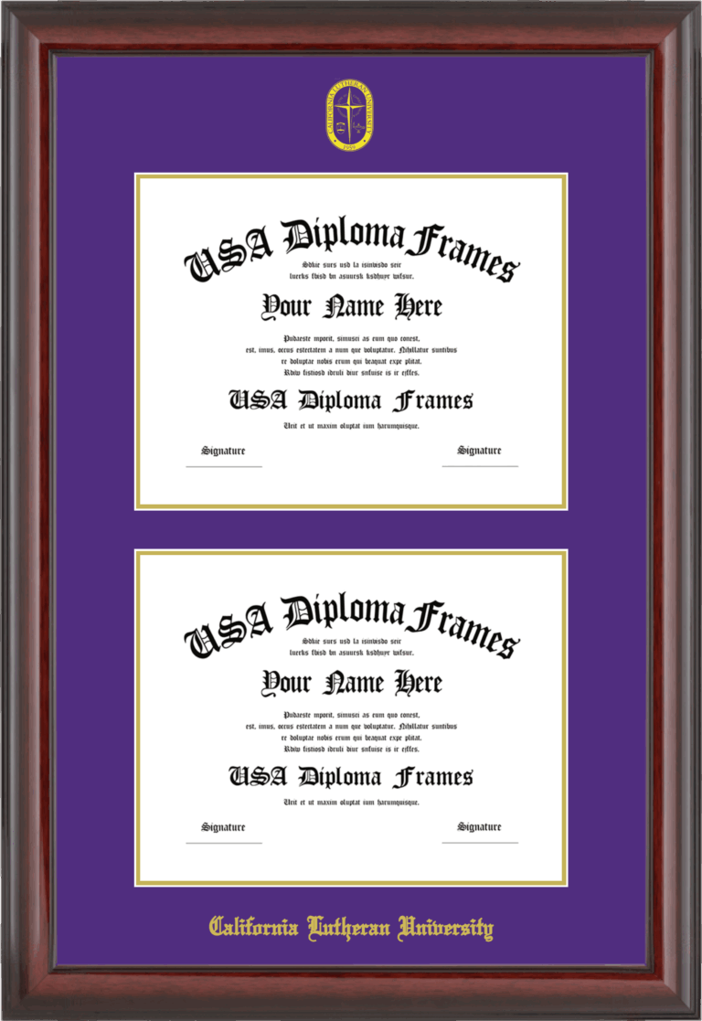 California Lutheran University Double Diploma Frame – Double Document – Cherry Mahogany Glossy – Purple and Gold Mat
