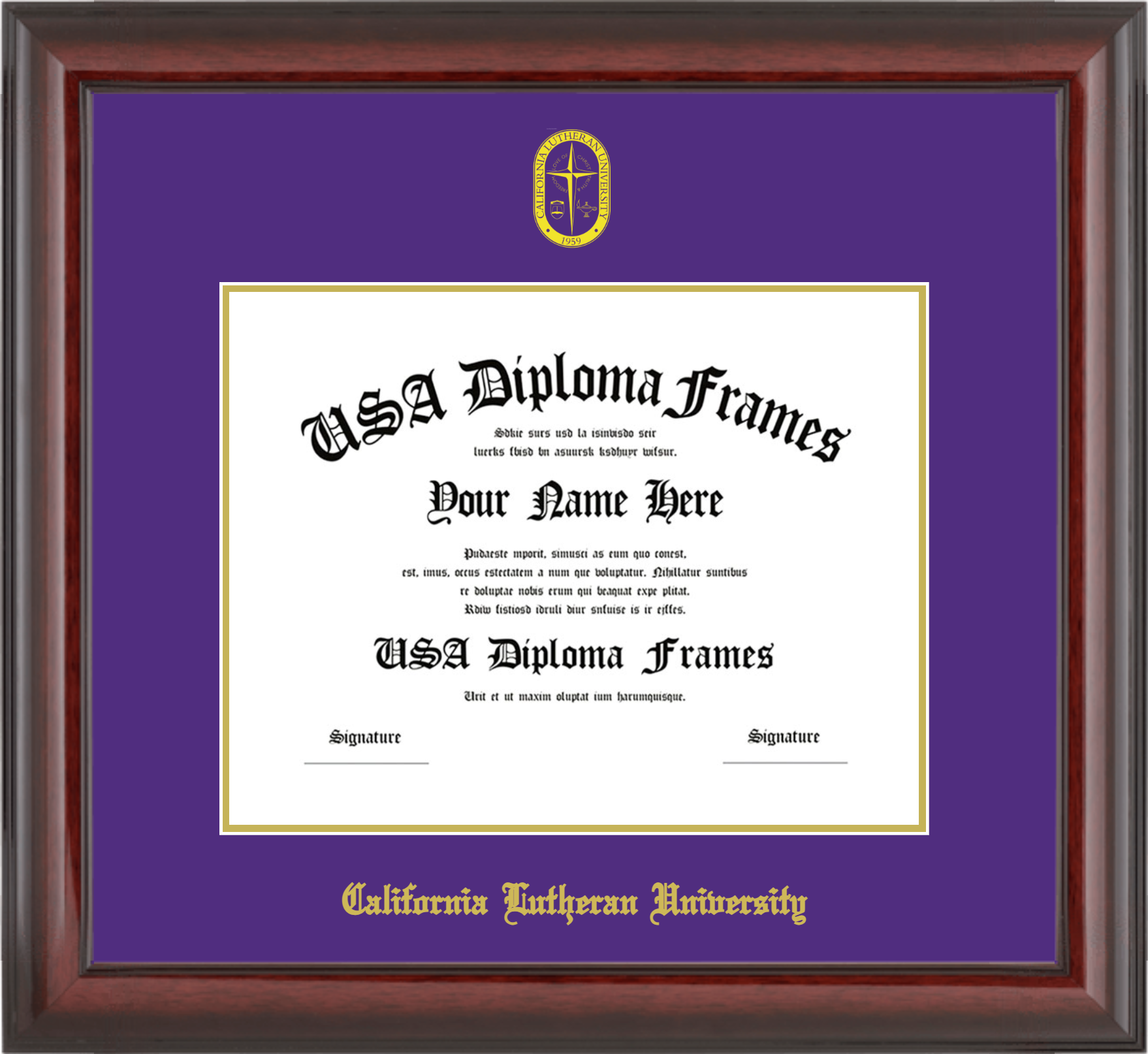 California Lutheran University – Single Horizontal Document ( Diploma ) – Cherry Mahogany Glossy – Purple Mat – Gold Accent Mat – With Seal(University Seal Gold) – With Gold Embossing (California Lutheran University)